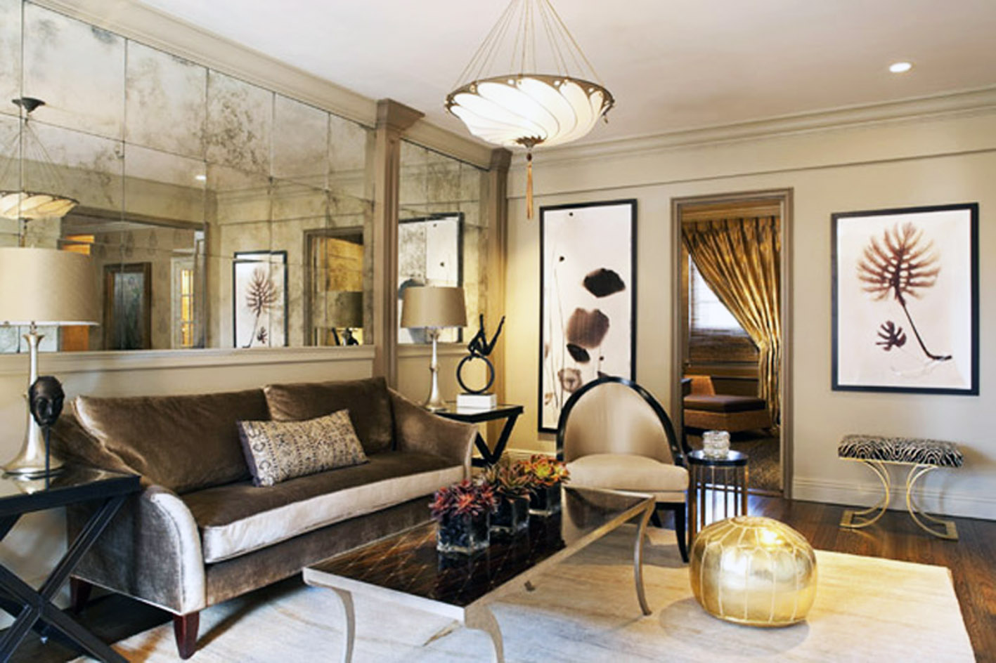 L'espace salon sera doublé visuellement si un mur est recouvert de tuiles miroir