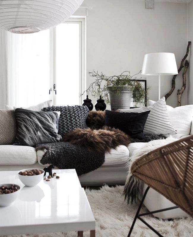 - Oreillers pour un canapé ou des fauteuils. Ils peuvent être sélectionnés pour correspondre au mobilier, en ne mettant en évidence que la texture, ou délibérément pour accentuer la couleur.