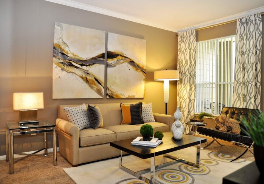 Le salon dans des tons beiges donnera non seulement une sensation de plus d'espace, mais ajoutera également de la chaleur et du confort. La couleur beige est un excellent fond pour différentes couleurs de meubles. Les couleurs naturelles, froides et lumineuses auront fière allure.