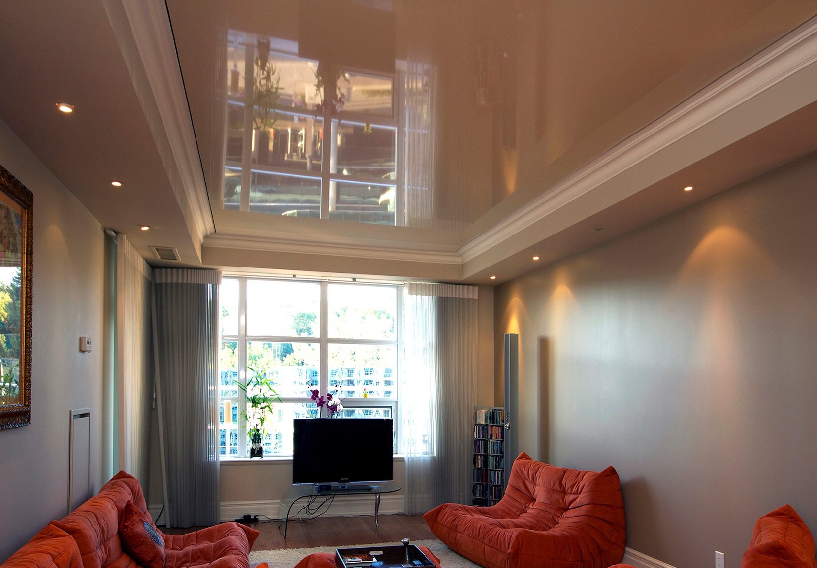 Un plafond tendu avec une surface brillante sera une excellente solution pour une pièce avec des fenêtres sur le côté nord de la maison
