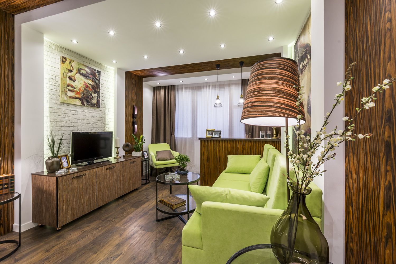 Une salle aux couleurs vertes - entoure de paix et de tranquillité, et ajoute également du volume aux lignes.