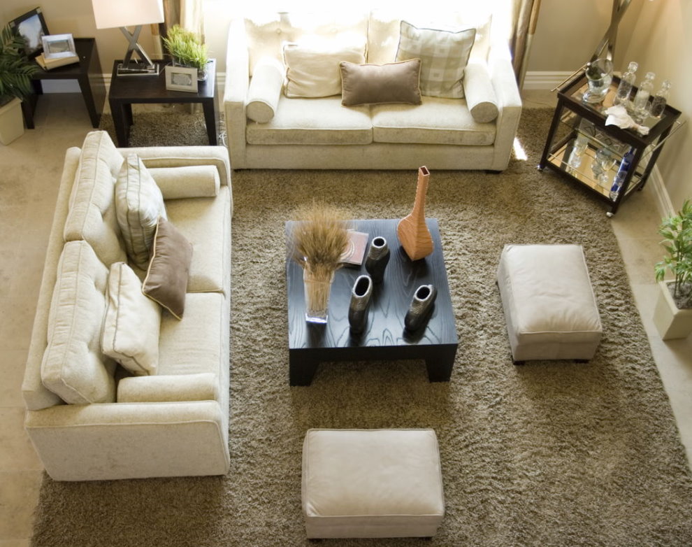 Au lieu d'une table basse, vous pouvez utiliser des poufs doux, qui sont également utiles comme siège supplémentaire