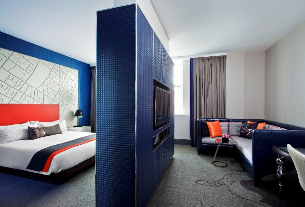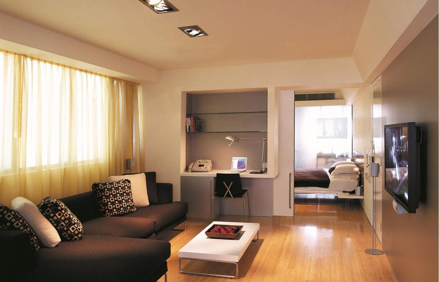 Le salon, qui fait office de salle de repos nocturne, est recommandé d'être divisé en zones. À cette fin, utilisez la méthode de placement des meubles ou des cloisons spéciales.