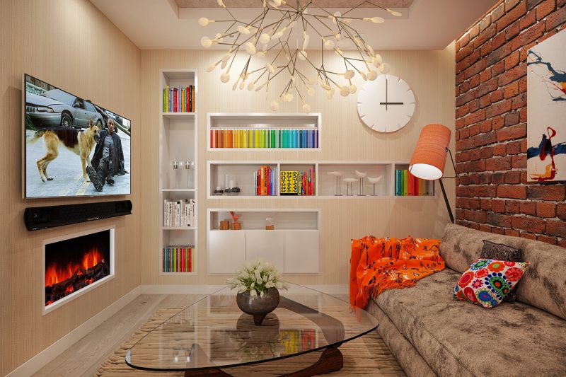 Dans un salon typique, il est permis de placer un lieu de travail, d'installer plusieurs fauteuils standard ou sans cadre et de mettre une table basse. Ici, la présence de toutes sortes de petits éléments de mobilier, décoration différente n'est pas interdite.
