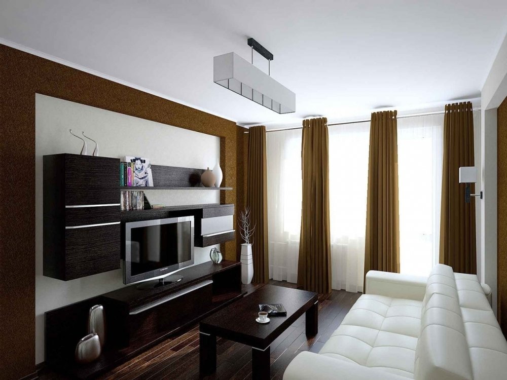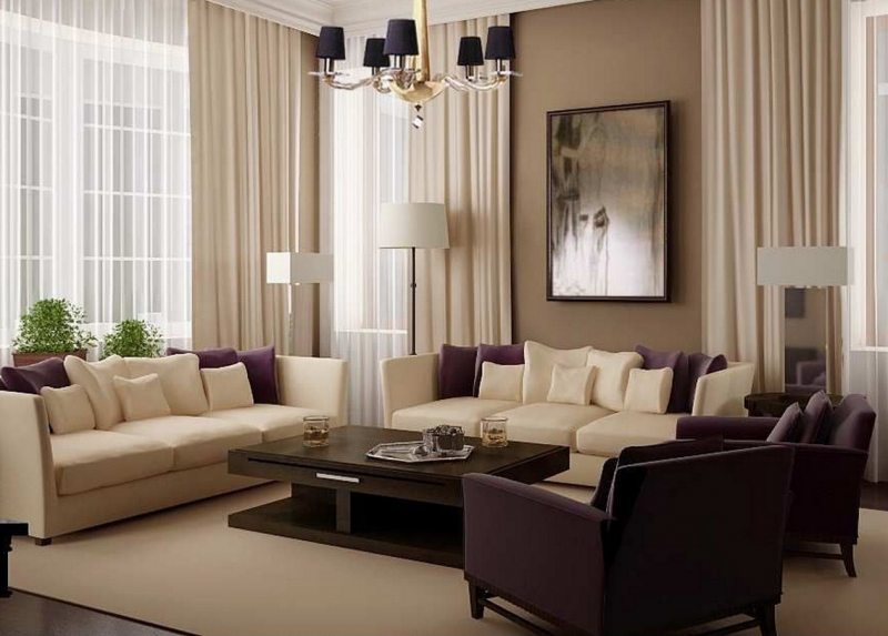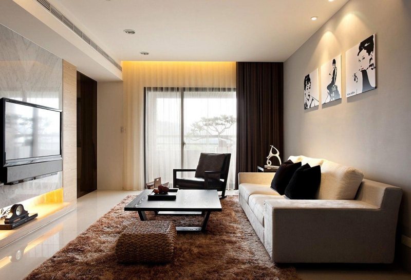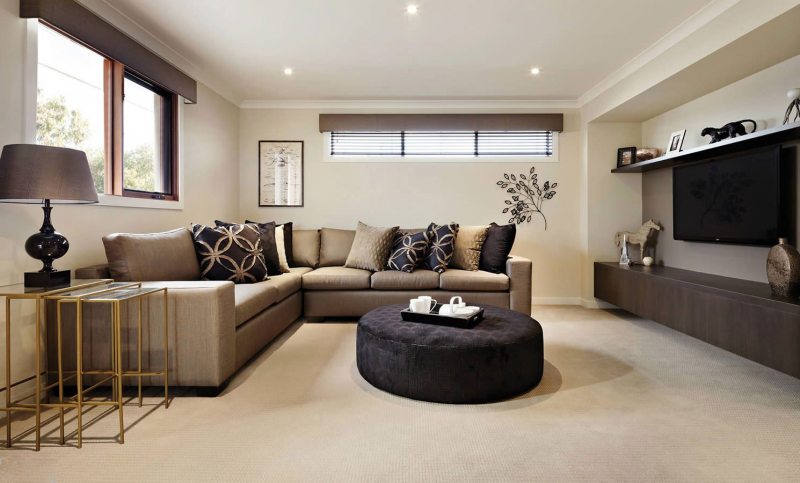 Dans ce cas, même la taille et la géométrie de la pièce ne sont pas déterminantes. Dans un tel salon, le canapé joue généralement le rôle principal. Vous pouvez placer cet objet au centre, le long du mur, près de la fenêtre. L'emplacement dans le coin est rarement utilisé.