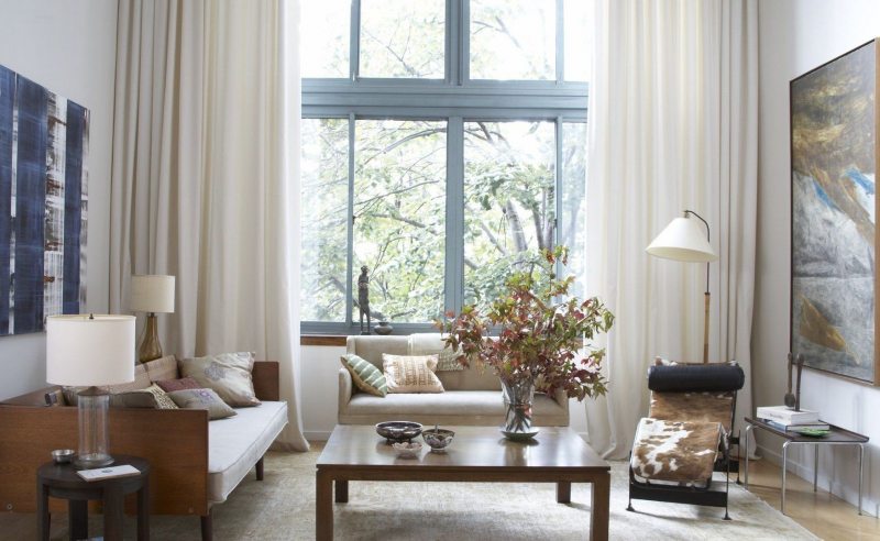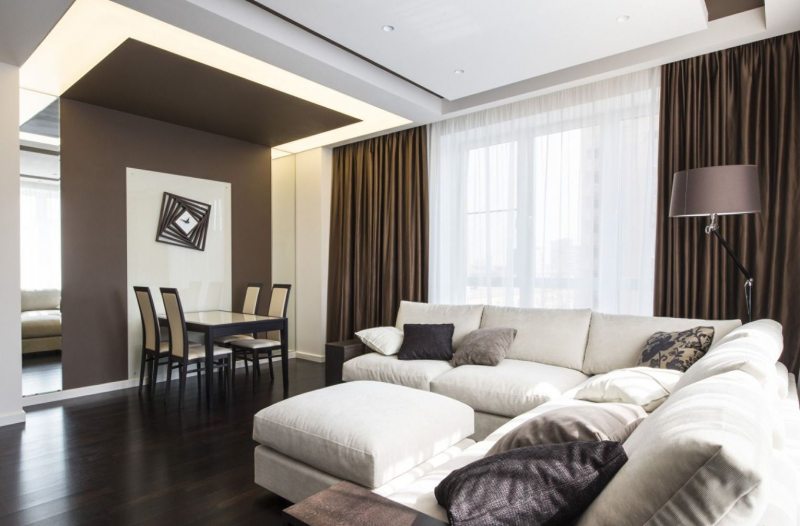 Rideaux occultants sur la corniche du plafond - l'un des moyens les plus simples de zoner un espace commun