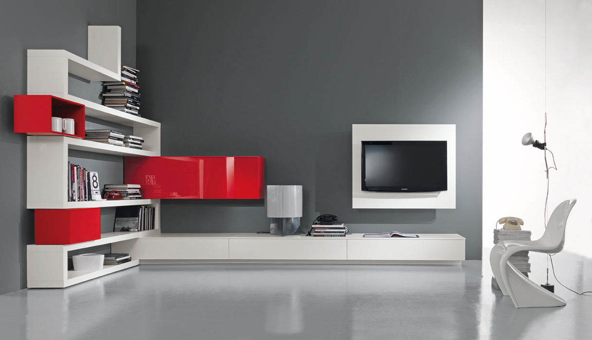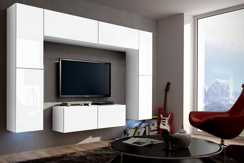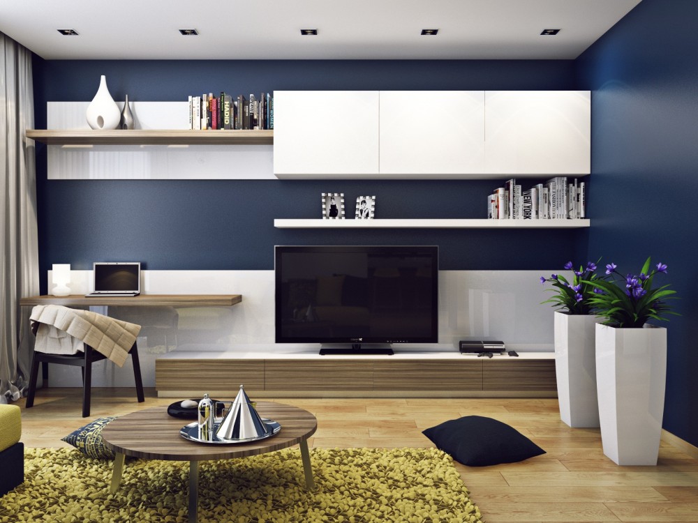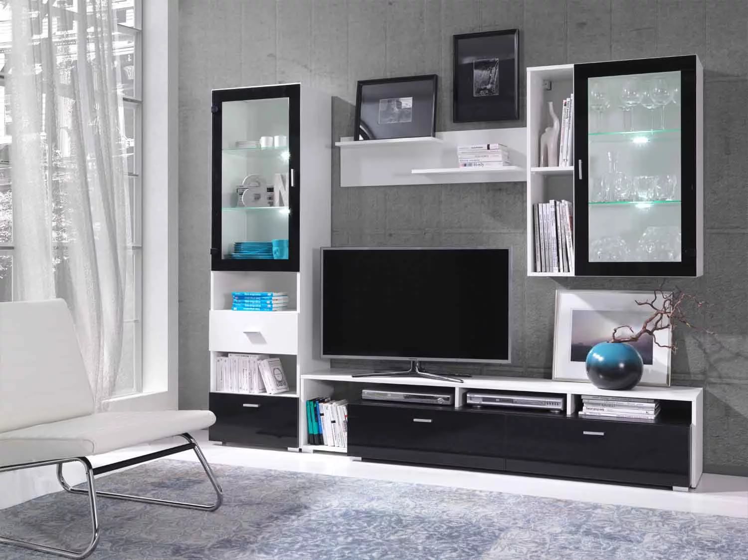 La création d'une zone de loisirs n'est pas un caprice des designers, mais une façon d'utiliser l'espace à proximité du téléviseur de manière pratique et confortable, qui reste souvent inutilisée. L'installation du mur dans la pièce dans un style moderne avec un téléviseur est une excellente occasion d'utiliser l'espace pour ranger votre bibliothèque personnelle, vos objets personnels et vos appareils électroniques en raison du grand nombre d'étagères et de supports.