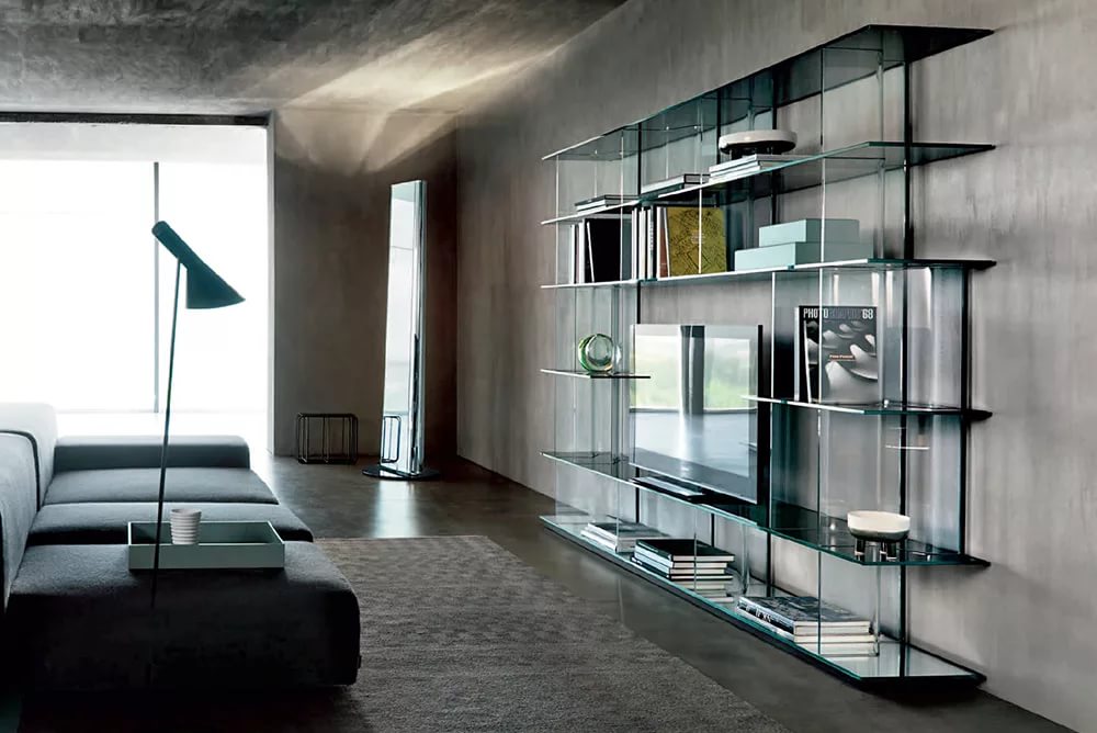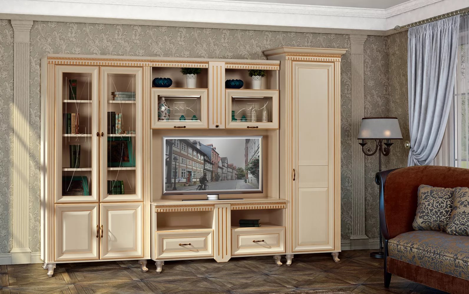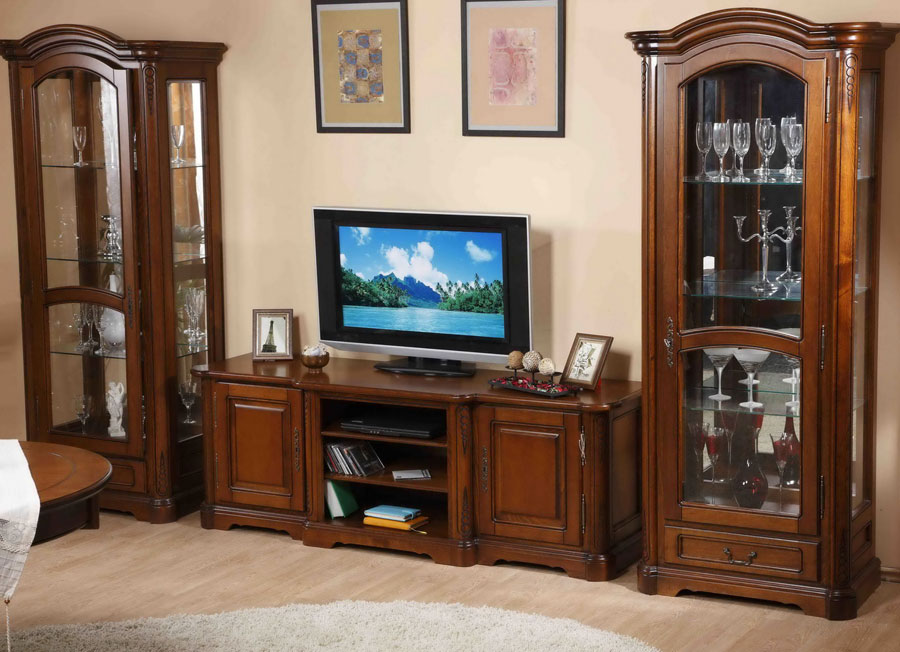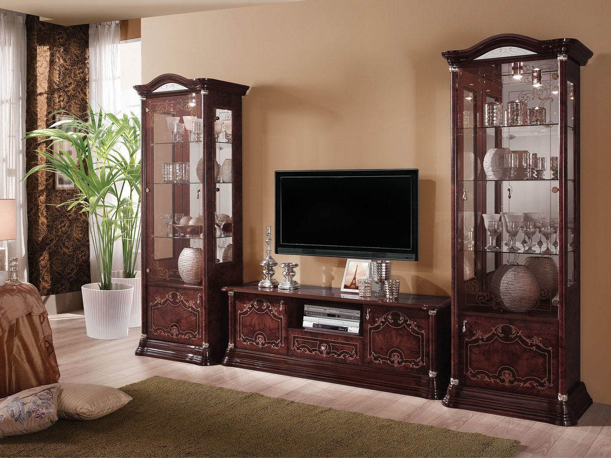 Les meubles en bois massif avec des motifs en filigrane, les pieds sculptés et les étagères en verre seront beaux pour un intérieur classique.