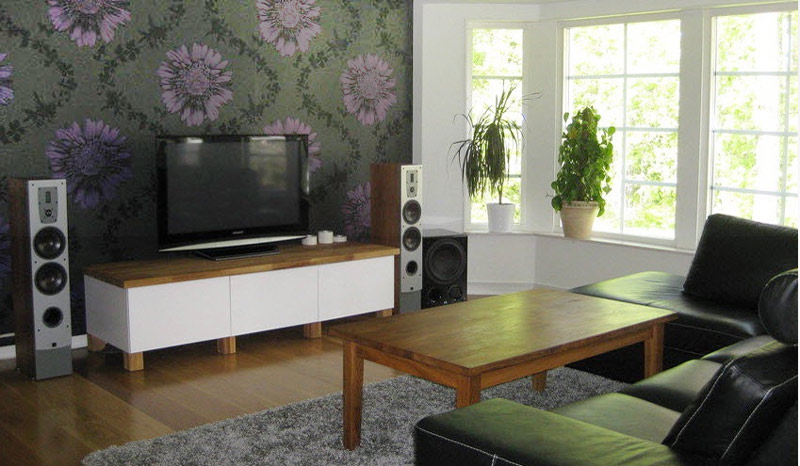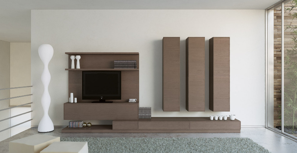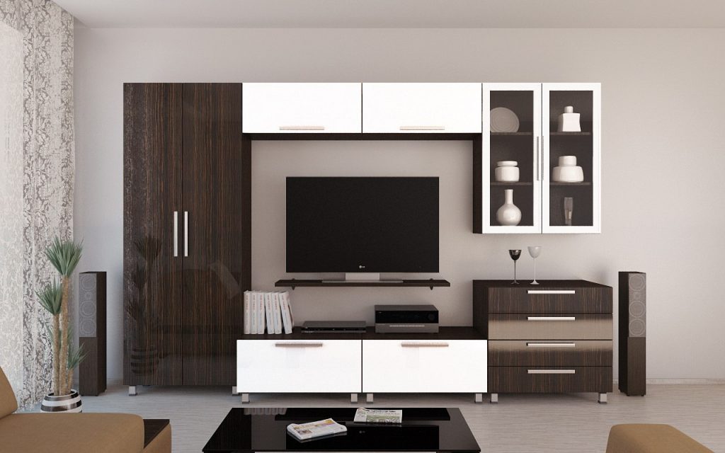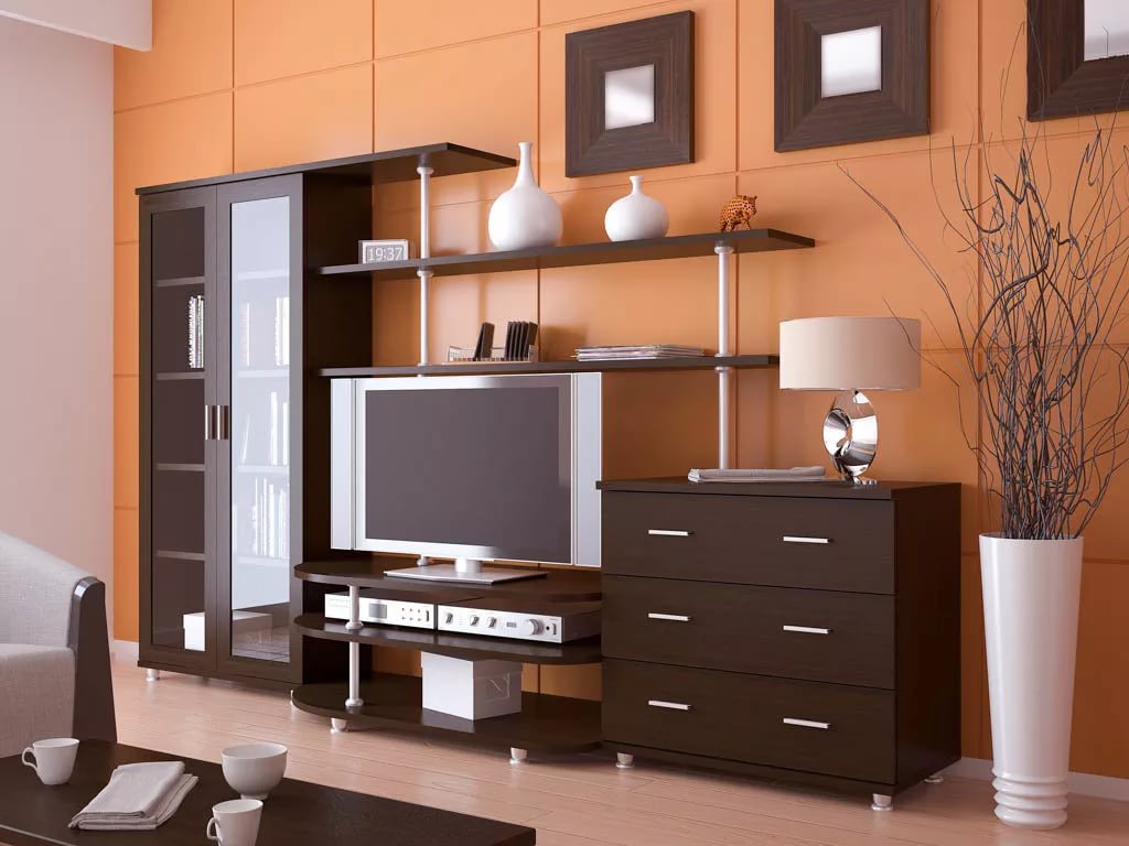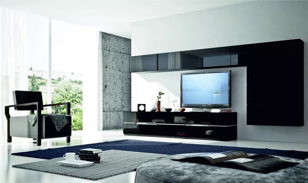 La plus traditionnelle est la disposition des objets le long du mur. Au contraire, des meubles rembourrés sont installés pour une visualisation confortable de vos émissions préférées. Les murs d'angle sont non seulement beaux, mais vous permettent également de regarder confortablement la télévision de n'importe où dans la pièce.