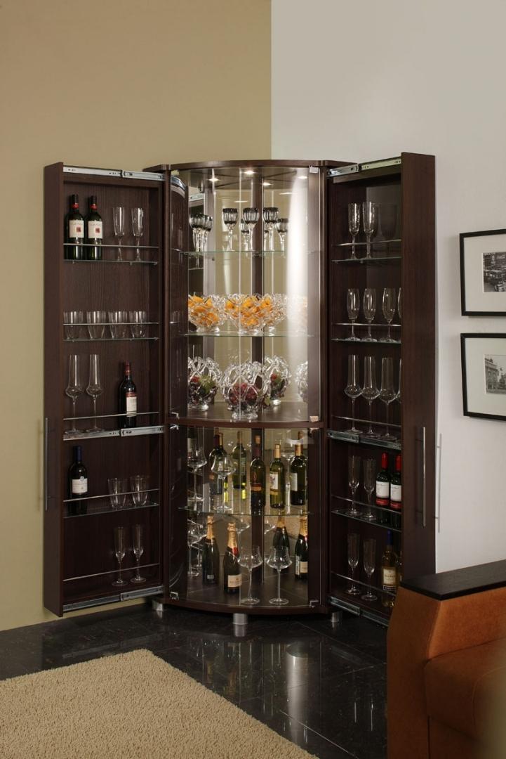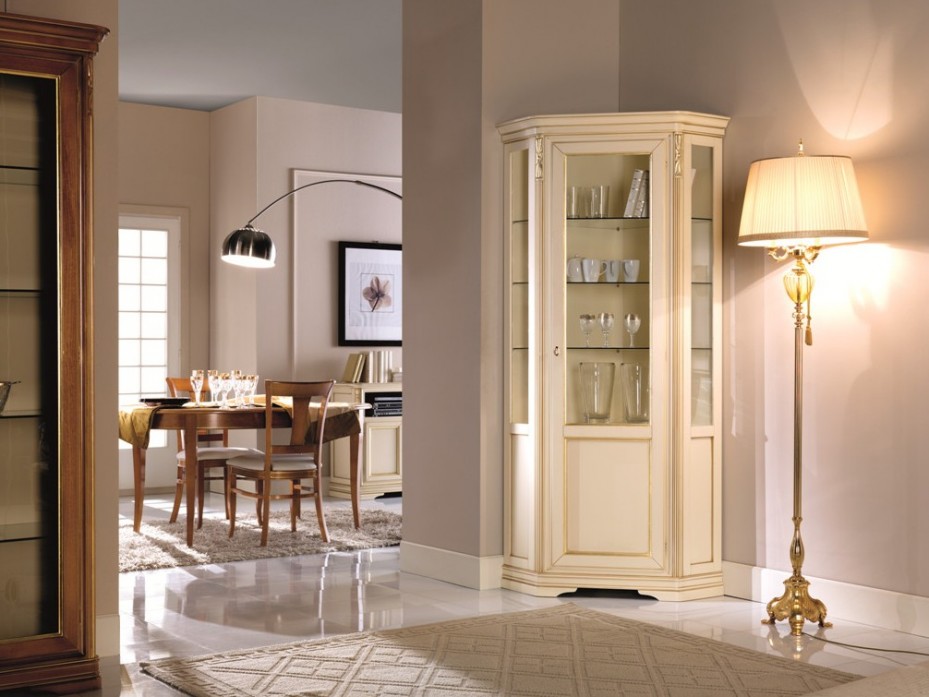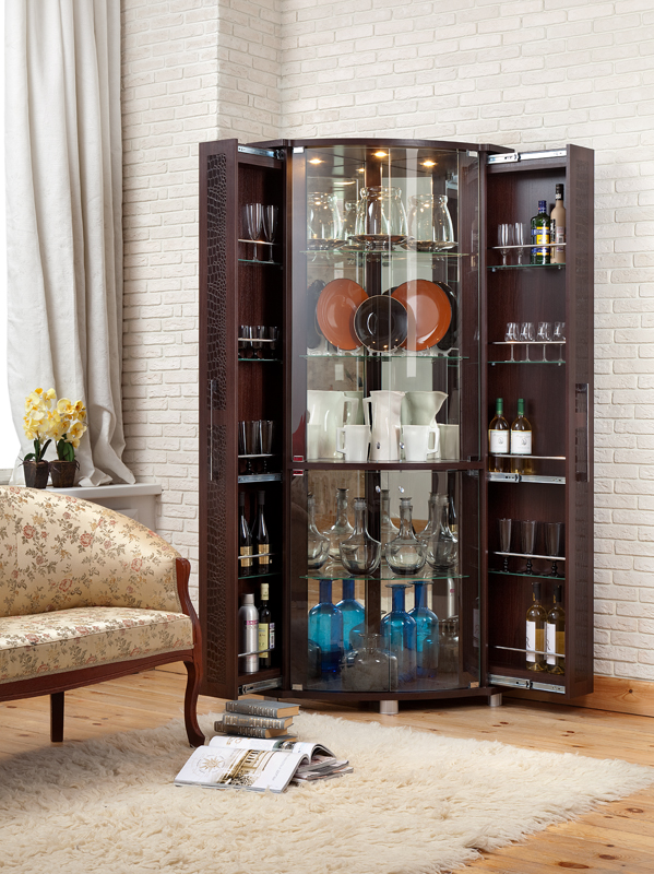 Vous pouvez décorer n'importe quel coin libre dans le salon avec une vitrine d'angle.