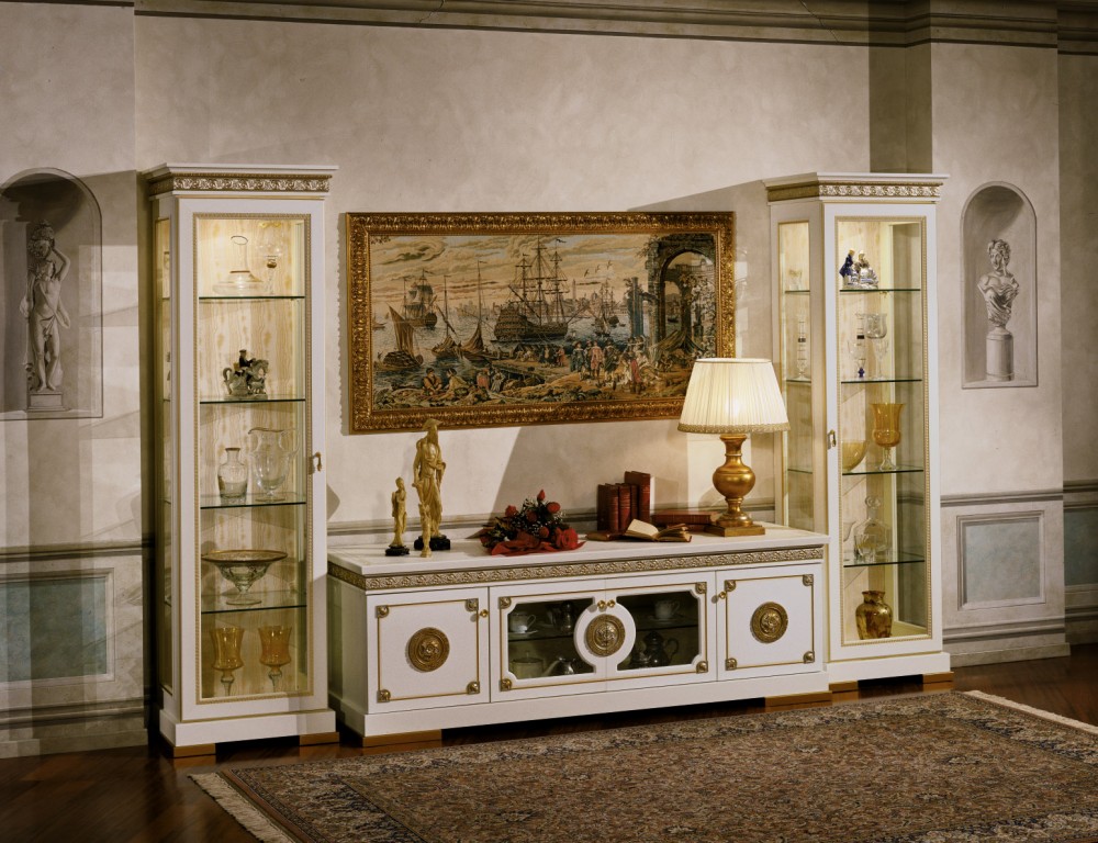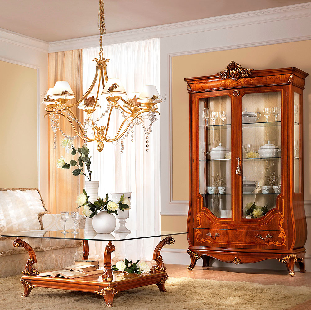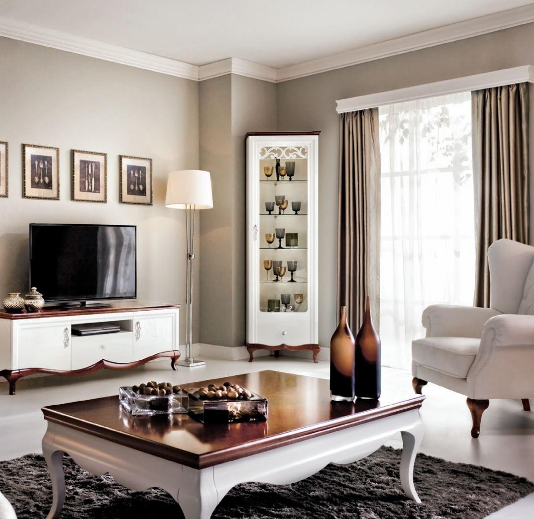 Si la pièce est lumineuse, elle peut utiliser des armoires sombres pour contraster et mettre en valeur les formes des meubles. Beaucoup préfèrent la couleur du wengé. Il est particulièrement adapté aux modèles classiques. Dans une pièce lumineuse, les meubles dans les tons auront fière allure. Les vitrines blanches et les vitrines en ivoire sont idéales pour les petits salons faiblement éclairés. Les meubles de couleur claire ne cachent pas l'espace et n'absorbent pas la lumière.