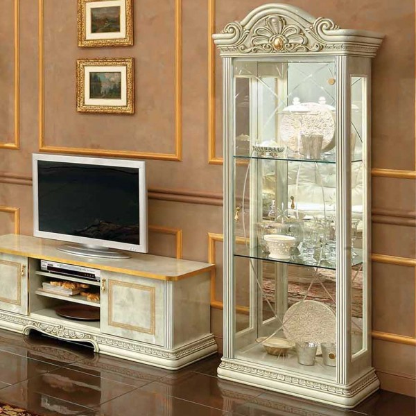 Une vitrine d'armoire permettra de diversifier l'intérieur du salon. L'essentiel est de sélectionner avec succès ce meuble et de l'adapter habilement à la composition de la pièce.