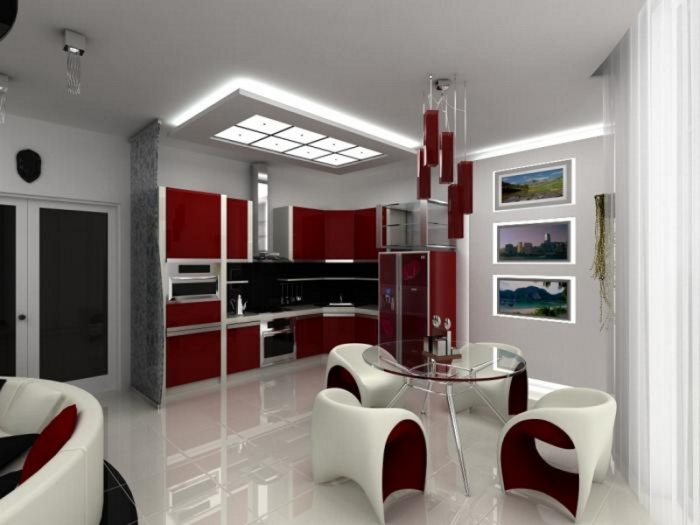 - À l'aide de cloisons sèches, vous pouvez donner vie à toutes vos idées et créer n'importe quelle géométrie du plafond sous la forme d'un ciel étoilé ou d'une cascade avec un éclairage supplémentaire. Un tel intérieur sera inoubliable. De plus, vous pouvez utiliser des poutres au plafond qui séparent visuellement le salon de la cuisine. Une petite sous-estimation du plafond de la cuisine soulignera avantageusement l'échelle et l'importance du salon. Les plafonds brillants augmentent visuellement l'espace et les plafonds mats réduisent - cela peut être utilisé dans la conception du plafond.