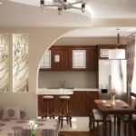 Il est assez simple et pas laborieux de diviser la cuisine et le salon en couleurs en deux zones, dans lesquelles il sera également pratique de cuisiner et de recevoir des invités en même temps. Il suffit de mettre en valeur la pièce avec de la couleur, mais cela doit être harmonieux et réalisé dans le même thème de décoration des murs, des sols et des plafonds. Si la superficie totale de la pièce est petite, il est préférable de choisir des teintes claires et uniquement le mobilier nécessaire, ne surchargez pas l'espace que vous agrandissez avec de nombreuses armoires, tables et ustensiles supplémentaires. La cuisine peut être assombrie et le salon est plus clair dans une couleur, mais dans une texture différente. La combinaison de meubles dans un même style joue un rôle très important dans la conception globale de votre maison.