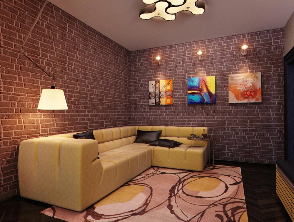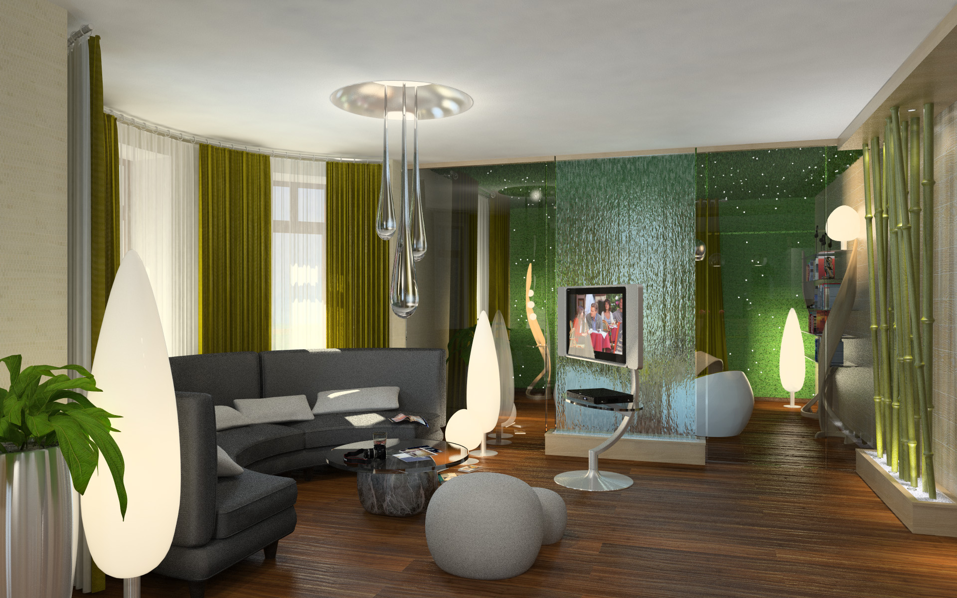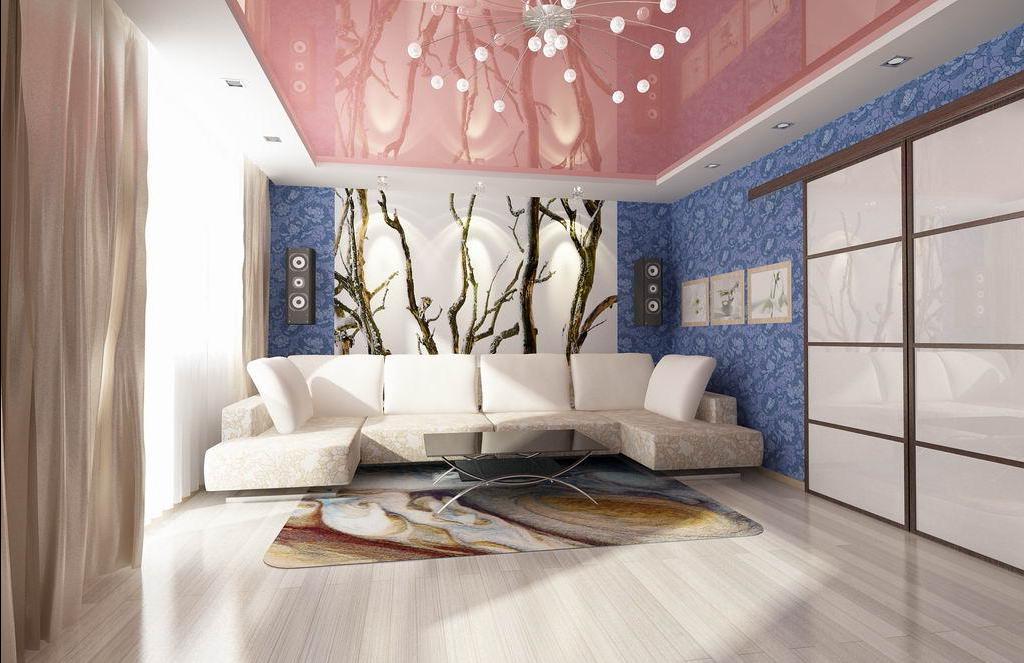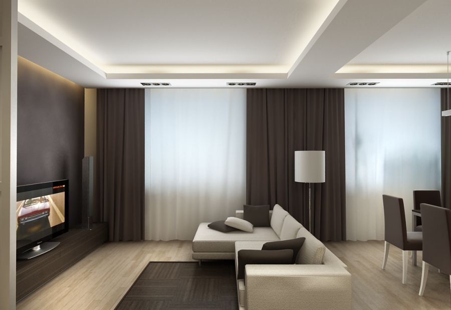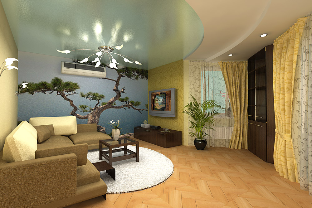 Commencez la planification de la conception avec le sol, le plafond. La pièce doit être sèche, chaude, confortable. Envisagez d'installer un système de chauffage par le sol. Cela est particulièrement vrai si le salon est souvent utilisé par les enfants pour les jeux. Le chauffage au sol permettra d'économiser sur le chauffage. Un bon système est absolument sûr, ne nécessite pas de gros coûts énergétiques. L'installation d'un tel système est effectuée uniquement par des professionnels.