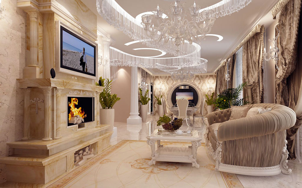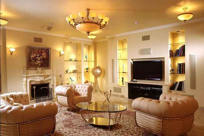 Salon - un espace reliant tous les autres appartements. Son intérieur doit être pensé dans les moindres détails. Le plus élémentaire est la définition du centre de l'appartement. Le centre peut être une grande table à manger, TV, cheminée, immense canapé. Cela dépend de l'objectif principal de la pièce. Pour chaque famille, cela peut être différent: un lieu de loisirs, de fêtes, de sport. Sur cette base, le reste de l'intérieur est construit.
