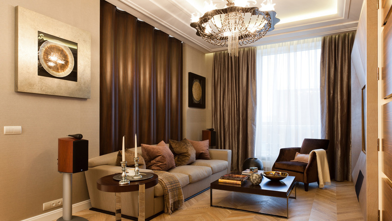 La solution idéale pour l'intérieur est le style classique. Dans le même temps, vous ne pouvez pas avoir peur d'utiliser des détails de design luxueux, des accessoires pompeux. Colonnes, moulures en stuc, miroirs, pièces forgées en métal, rideaux épais - tout cela s'intégrera parfaitement dans l'appartement. La chose la plus importante est d'éviter les contrefaçons, les accessoires bon marché. Leur utilisation sera extrêmement ridicule. S'il n'y a pas d'argent pour une réparation classique coûteuse, il vaut mieux privilégier le minimalisme.