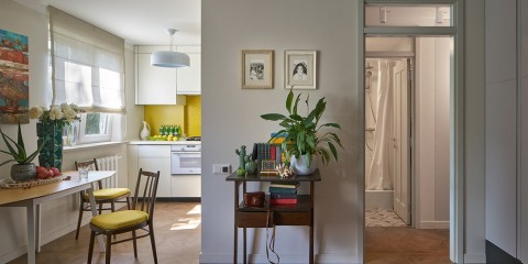 La salle à manger, située à la frontière entre la cuisine et le salon, agit comme un séparateur d'espace