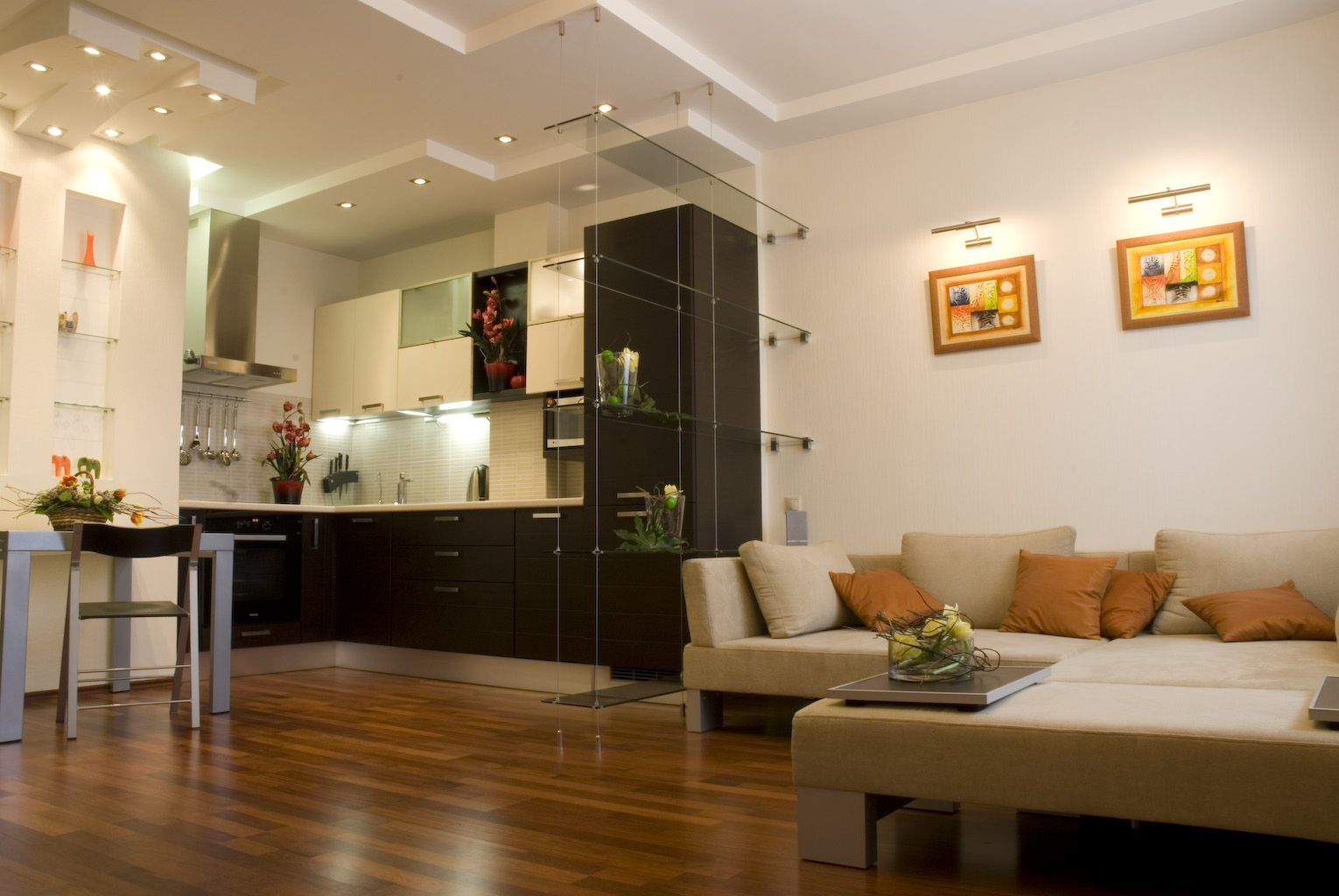 - Finitions et types de revêtements de sol. Le plancher devrait bien fonctionner. Lors de la décoration de l'espace de la cuisine, des carreaux doivent être utilisés, le parquet, le stratifié, le linoléum conviennent à la pièce à vivre. Les transitions entre elles peuvent être lisses ou géométriques.