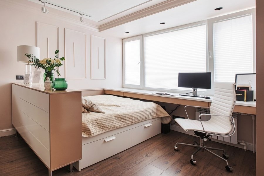 L'endroit où dormir doit être situé à la distance maximale de la porte de l'appartement, il est recommandé de le séparer du reste de l'espace à l'aide d'un écran ou d'une cloison. La meilleure option dans ce cas est l'installation d'un lit armoire. Un rebord de fenêtre peut être utilisé comme lieu de travail; il convient au stockage de documents, papiers. S'il y a de l'espace libre, le bureau doit également être placé plus près de la fenêtre.