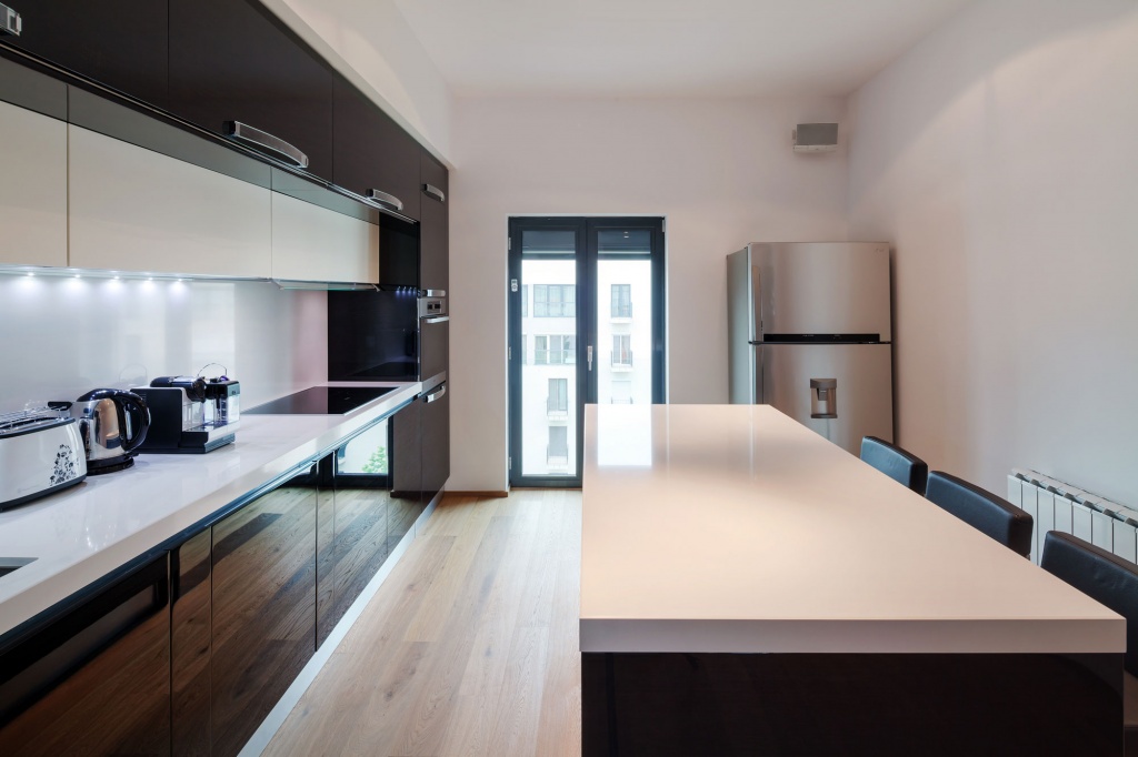 Cuisine sans armoires suspendues - cette solution est particulièrement utilisée dans les intérieurs modernes, tendant au minimalisme