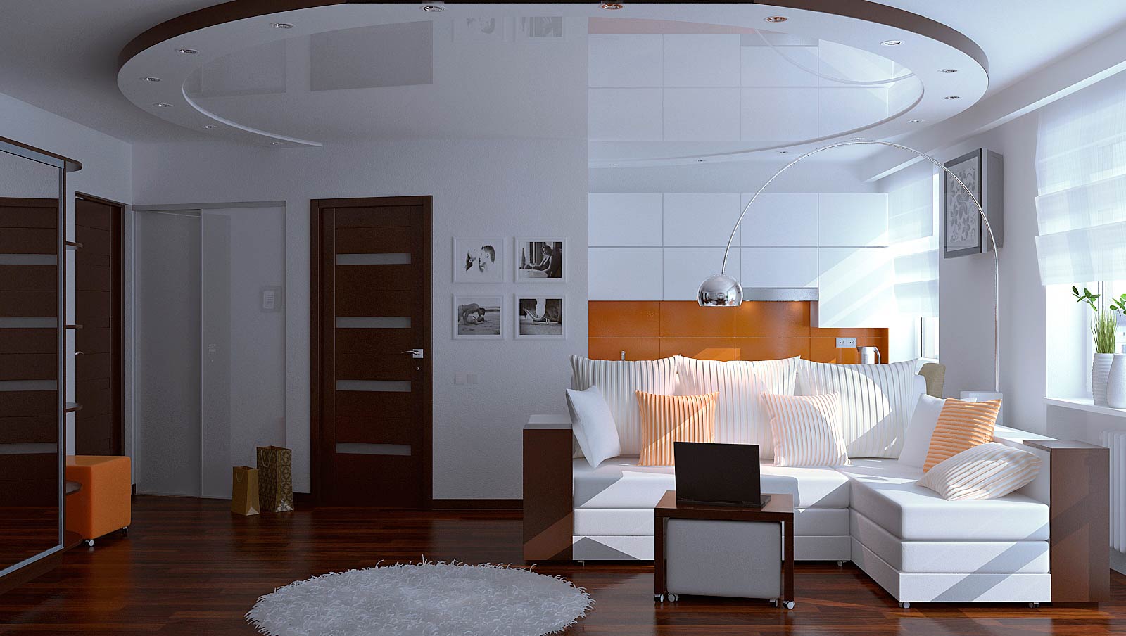 Dans une petite pièce, il est nécessaire d'utiliser des couleurs claires et claires. Ainsi, vous pouvez rendre l'appartement plus spacieux et plus large. Utilisez des motifs de plafonds légers, des peintures crème, lait ou beiges avec de légers accents brillants dans le décor.