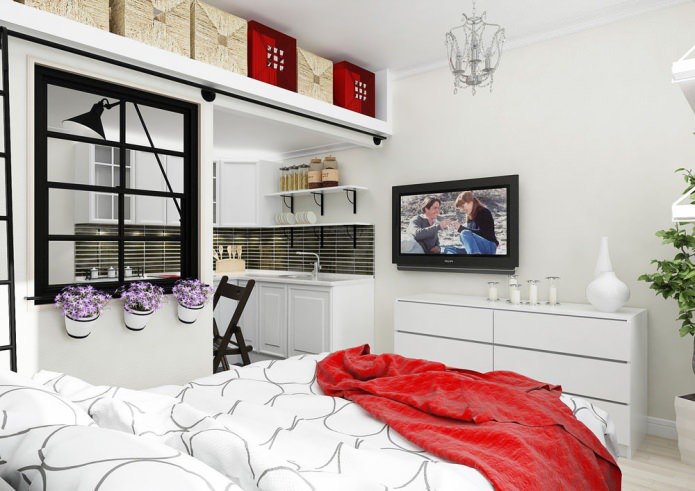 - Studio avec une fenêtre. L'intérieur du studio est de 26 mètres carrés de photographie avec un balcon et une fenêtre - c'est l'option la plus réussie. Cela crée une lumière naturelle qui peut être complétée par des nuances claires de design et des projecteurs. Tout cela peut agrandir visuellement la zone.