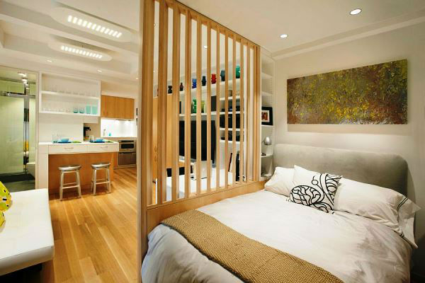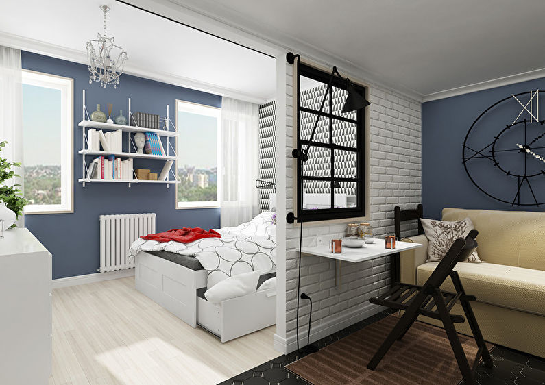 - Le zonage du studio est possible d'aménager à l'aide d'accents. Pour ce faire, utilisez le niveau d'intensité lumineuse, les meubles (armoires, comptoirs de bar, étagères).