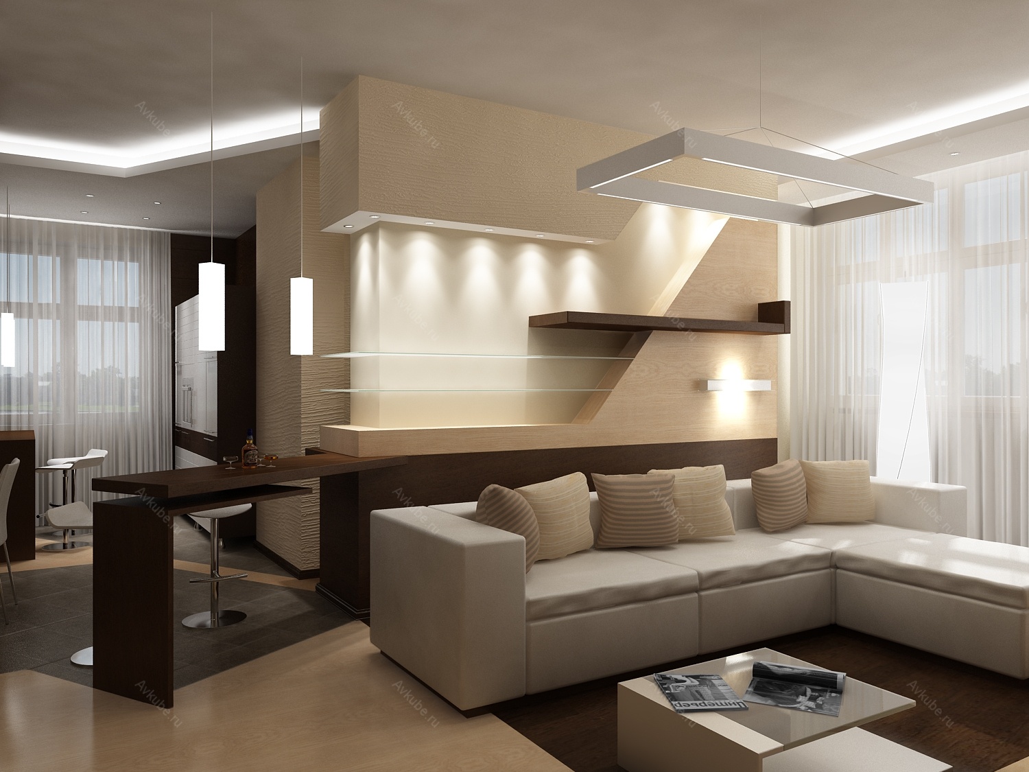 Il est recommandé de faire attention à la localisation des zones (pour le travail, le repos, la cuisine et les repas). Dans la plupart des cas, un environnement confortable est obtenu grâce à l'utilisation d'un style moderne, de meubles rembourrés confortables dans les zones de loisirs, d'une cuisine multifonctionnelle. Un charme particulier est donné par un éclairage à plusieurs niveaux.