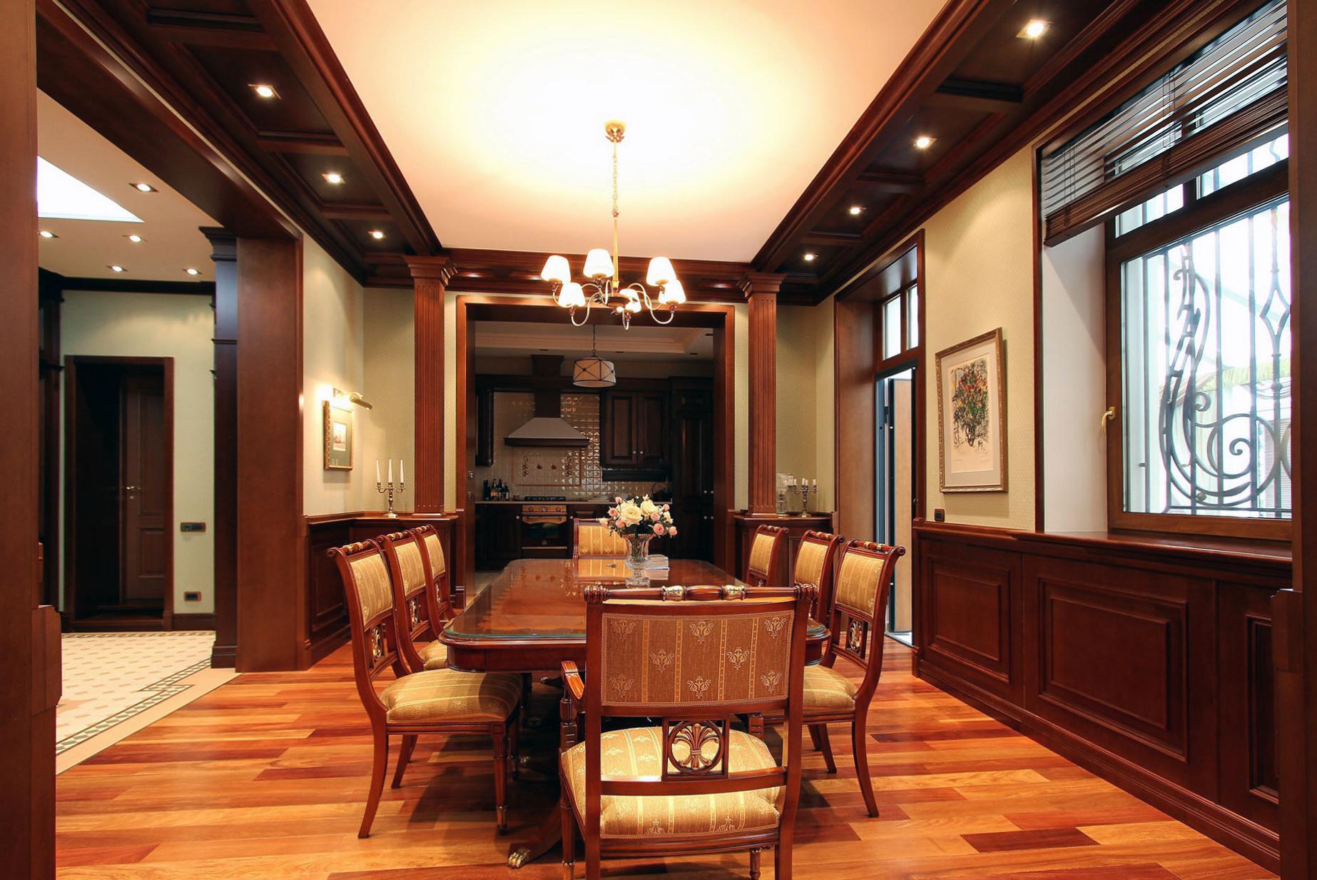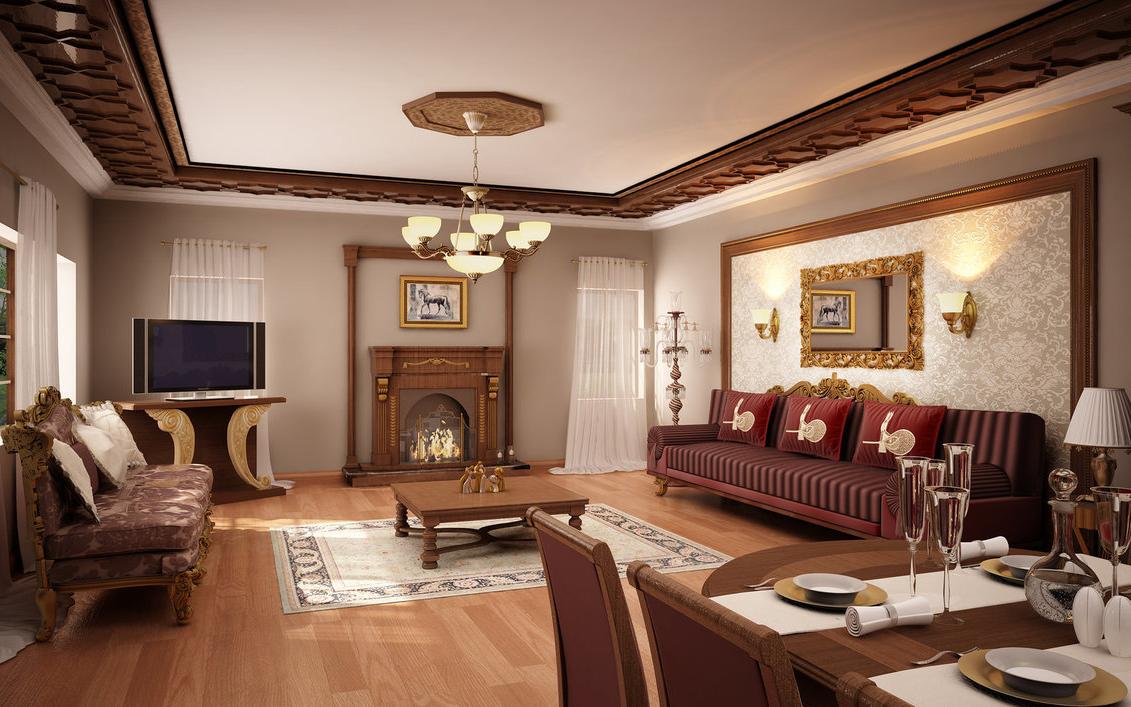 Le plafond peut être décoré d'éléments en bois, si la hauteur de la pièce le permet