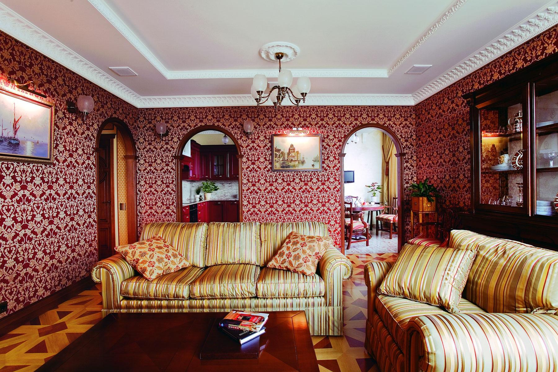 Le périmètre du plafond est complété par des moulures en stuc peintes dans la couleur principale du papier peint. Les matériaux suivants sont posés sur le sol: