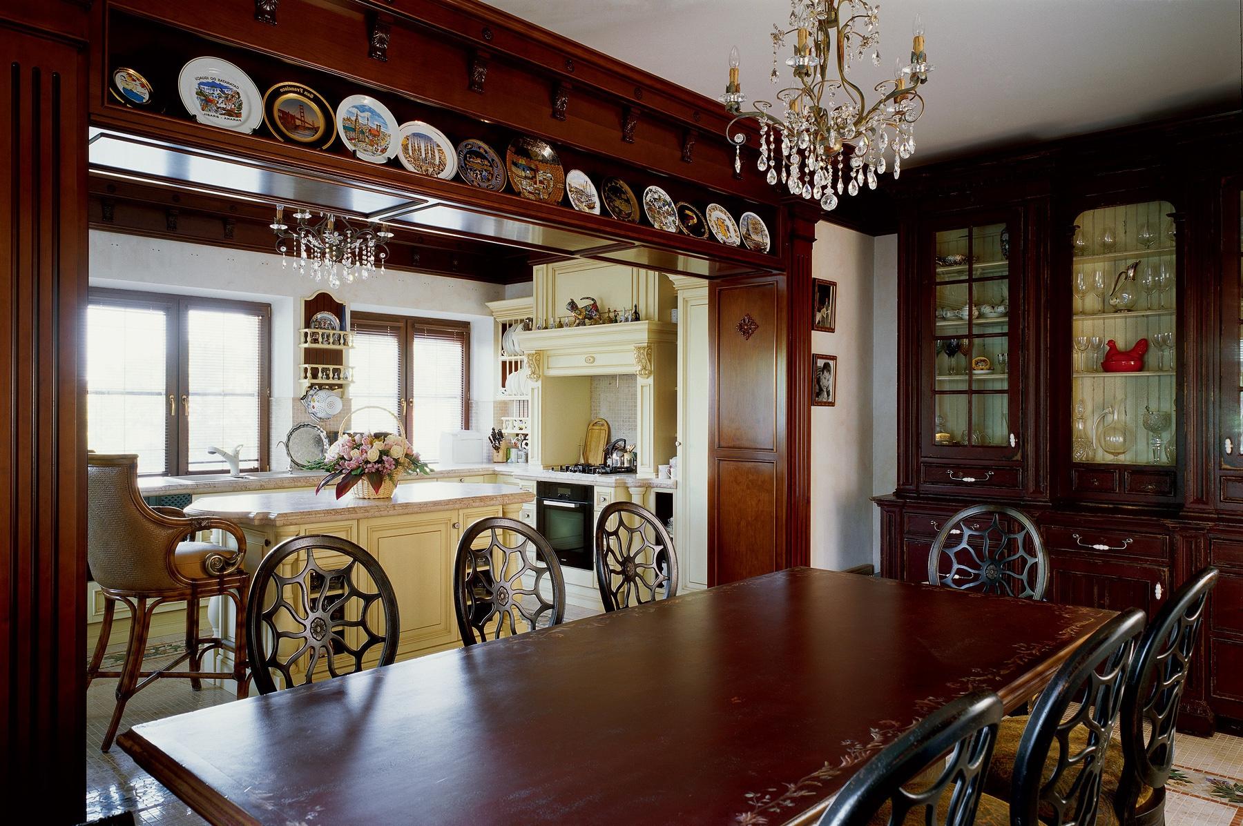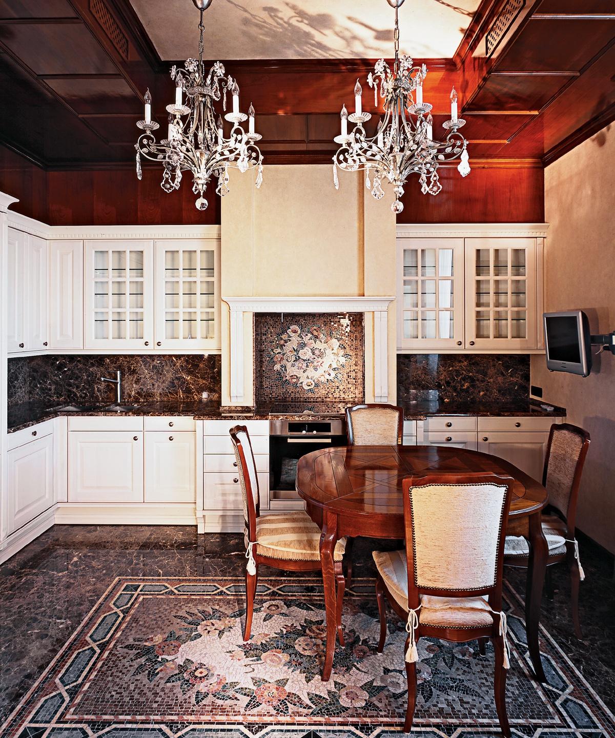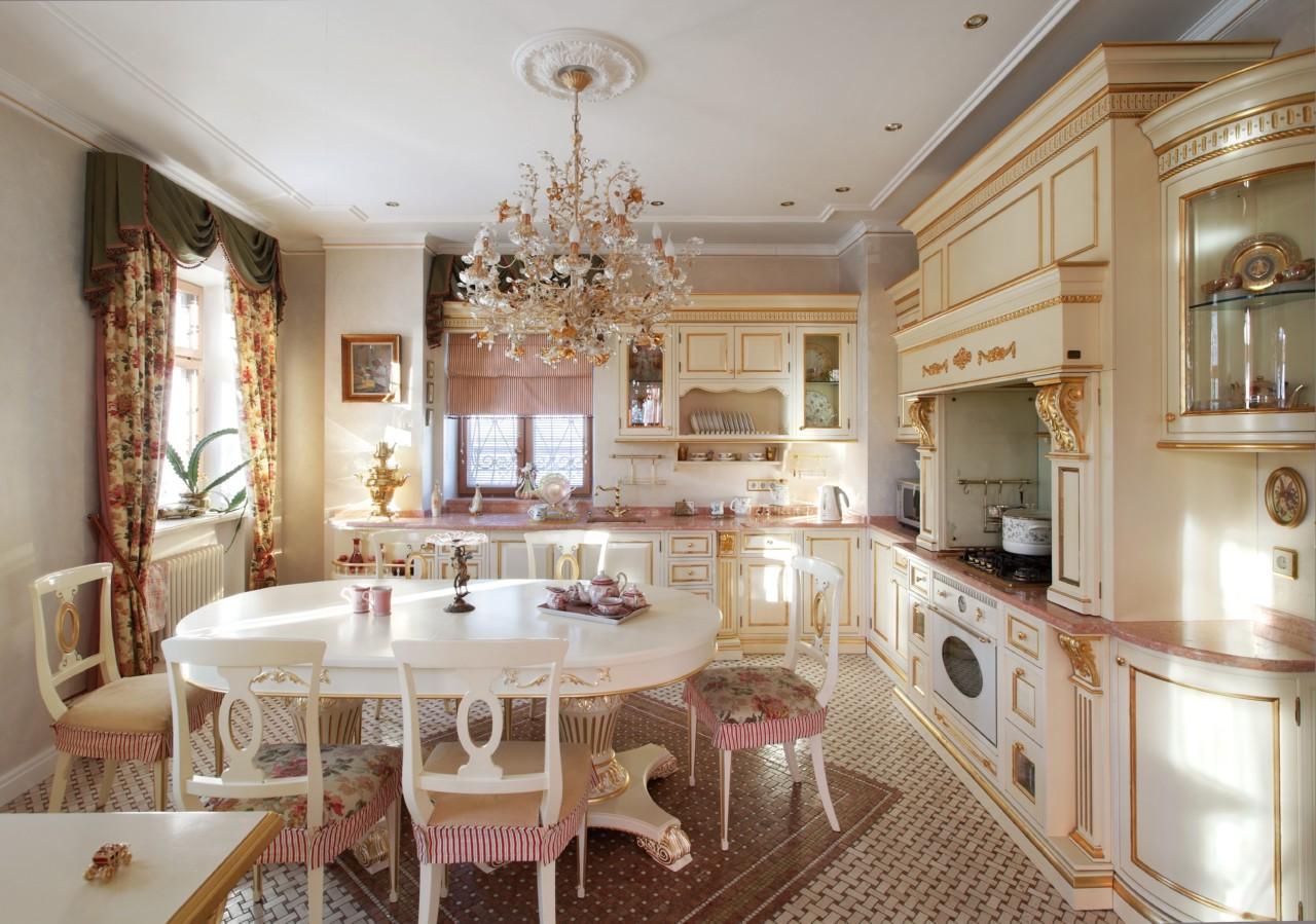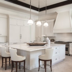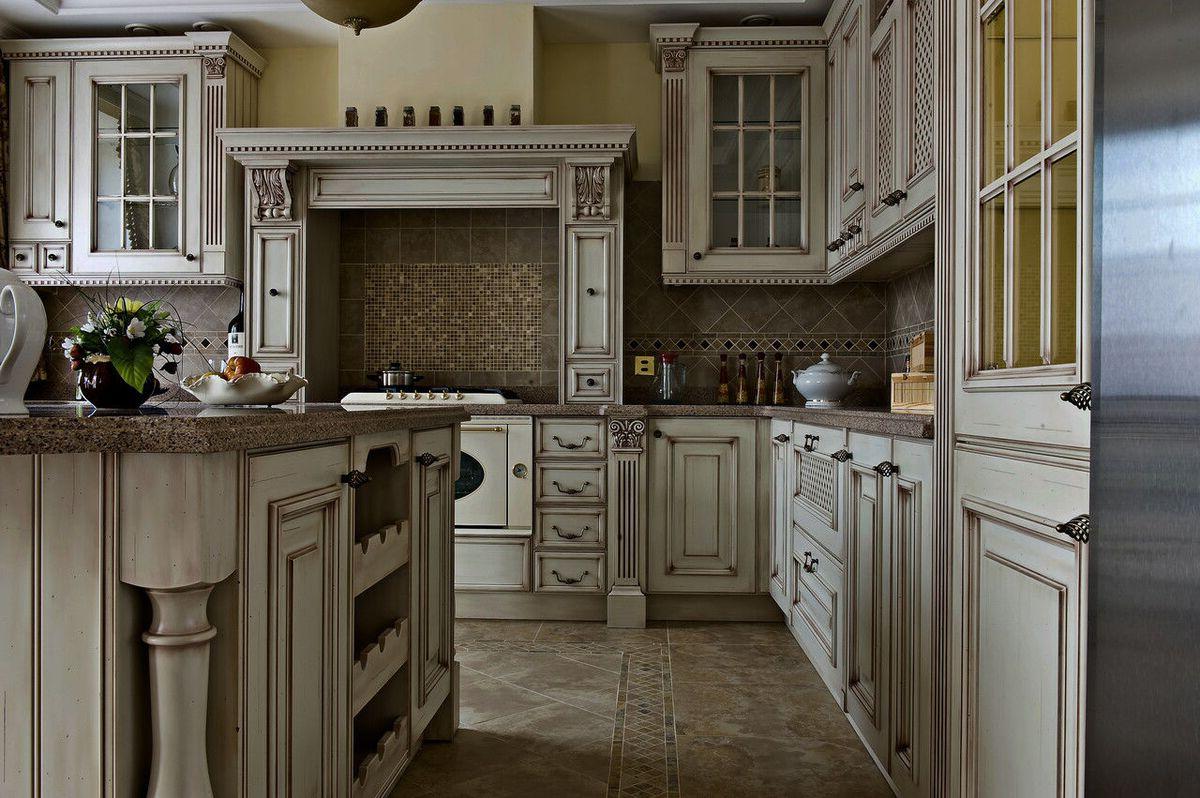 Pour le domaine fonctionnel, choisissez des meubles en bois massif. Le long du périmètre de la cuisine, il y a des casiers, des placards et des buffets, et au centre il y a un îlot ou une table à manger avec des chaises. Les appareils électroménagers sont cachés dans les meubles. L'intérieur est complété par un poêle à l'ancienne, des robinets en laiton, des comptoirs en pierre naturelle et des éviers en céramique.