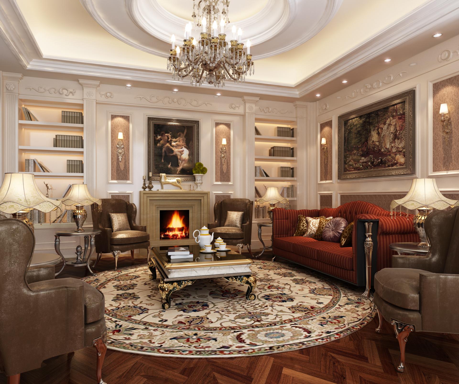 Salon anglais avec cheminée, décoré dans l'esprit du style gothique