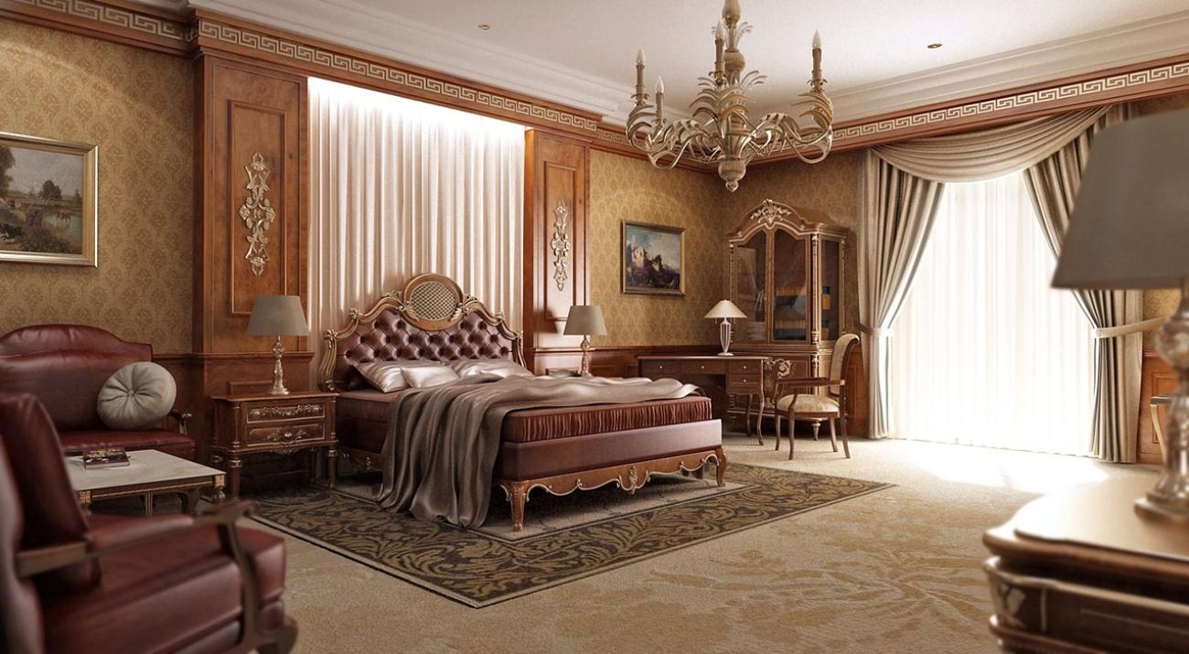 Ici, l'élément principal est un lit haut en bois avec un auvent ou un auvent. Vous aurez également besoin de nombreux oreillers de différentes formes et tailles, de tapis et de couvre-lits. Couvrez le sol de moquette et drapez les fenêtres de rideaux. La chambre à l'anglaise ne pourra pas se passer d'une coiffeuse ou d'une commode sculptée avec un miroir.