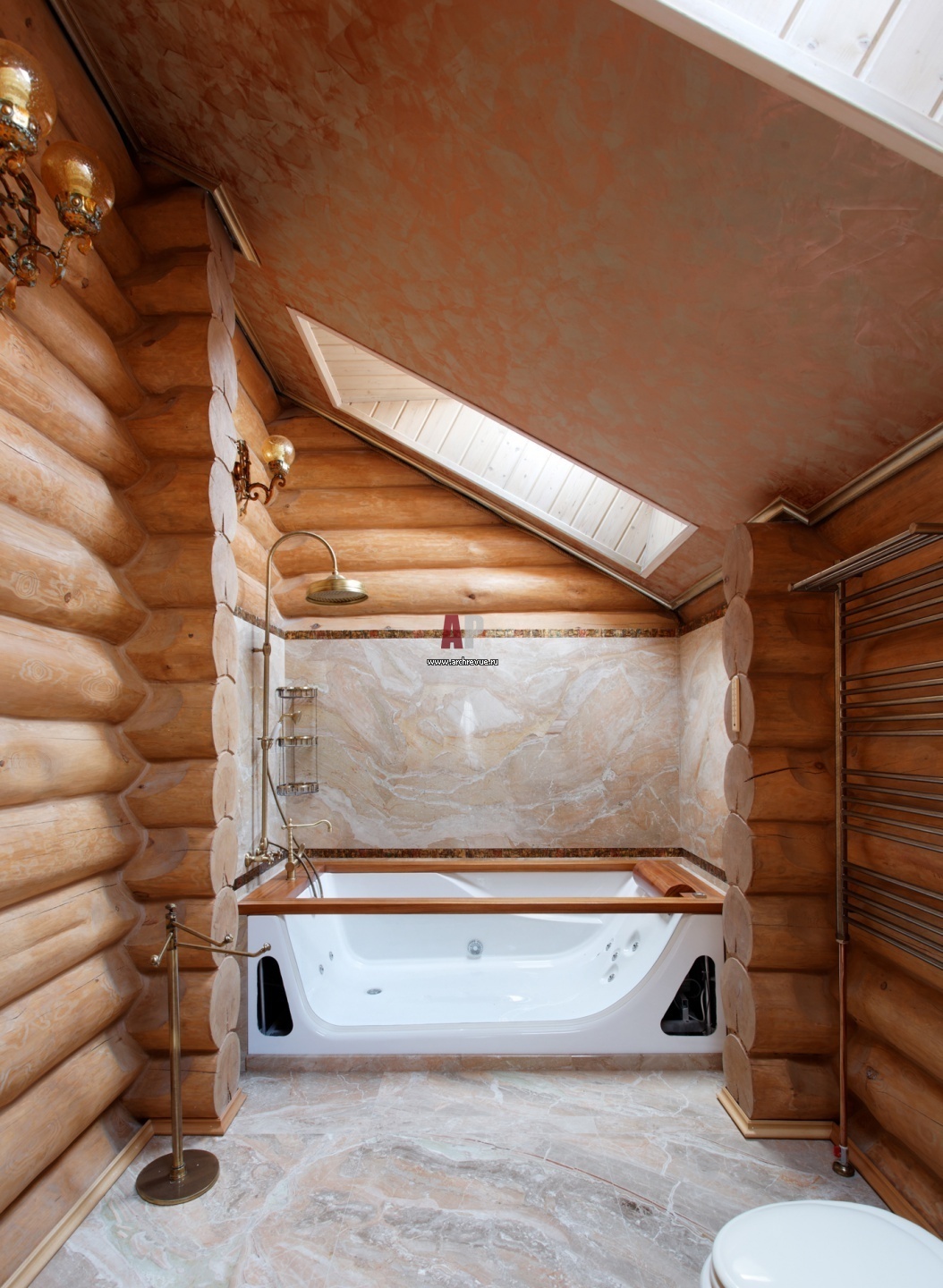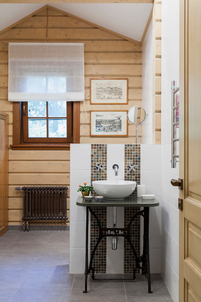 Créer une telle salle de bain dans le grenier d'une maison en rondins ne demande pas beaucoup d'efforts. Il suffit de traiter les bûches sur les murs avec une imprégnation et un vernis hydrofuge. Il en va de même pour le plafond (en règle générale, un panneau de plafond ou une doublure en bois naturel est utilisé). En guise de décoration, vous pouvez poser des tapis filés à la maison ou en patchwork.