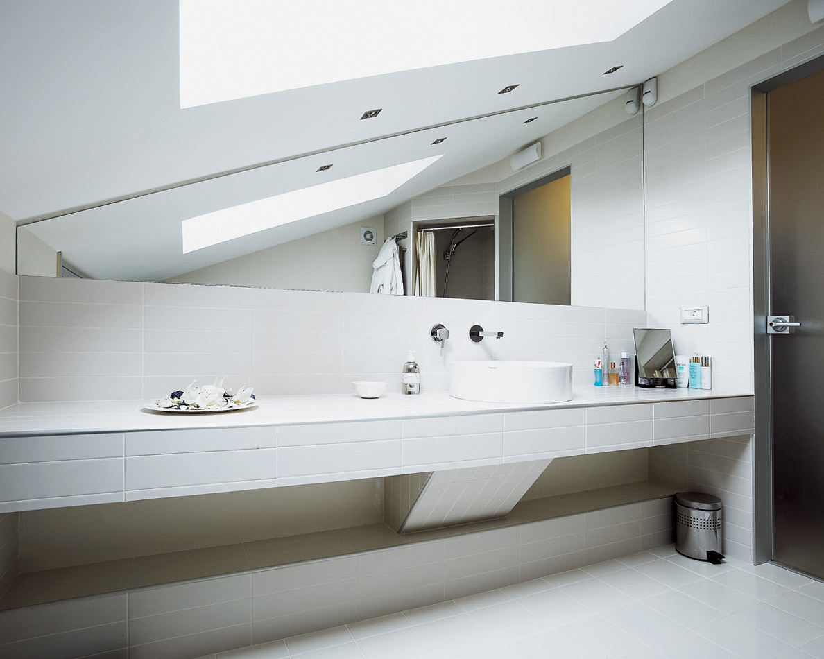 Dans une salle de bain spacieuse, l'éclairage est divisé en central et zoné