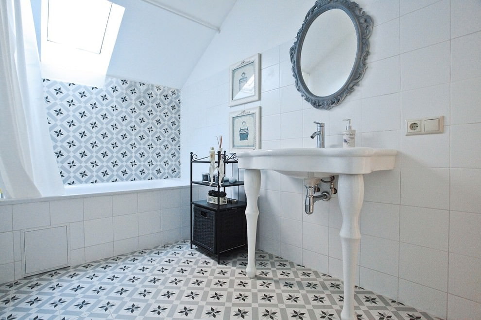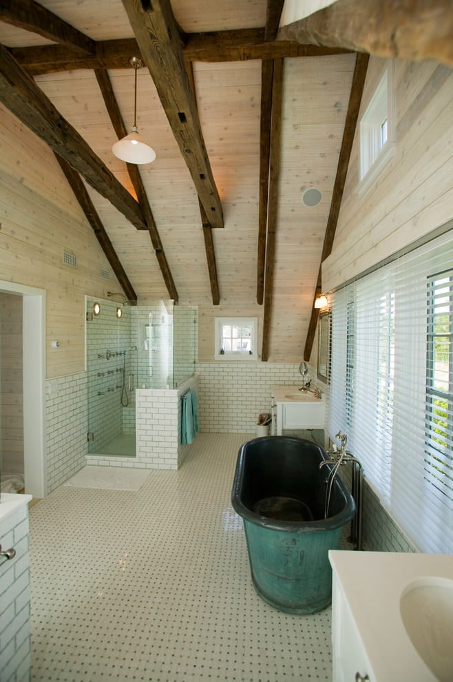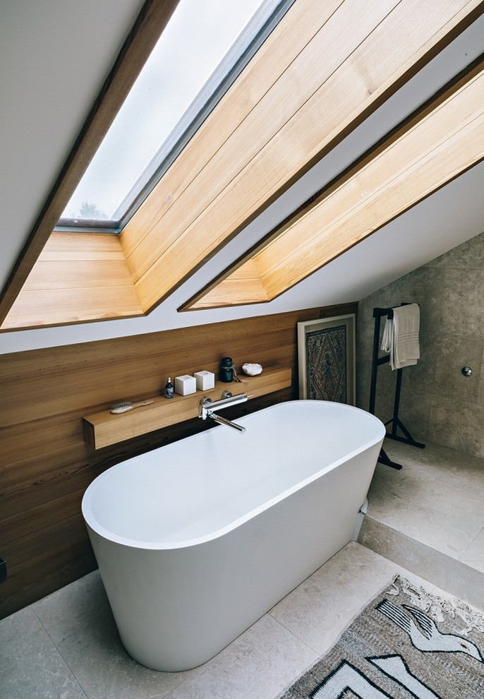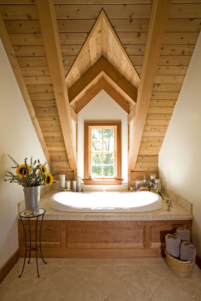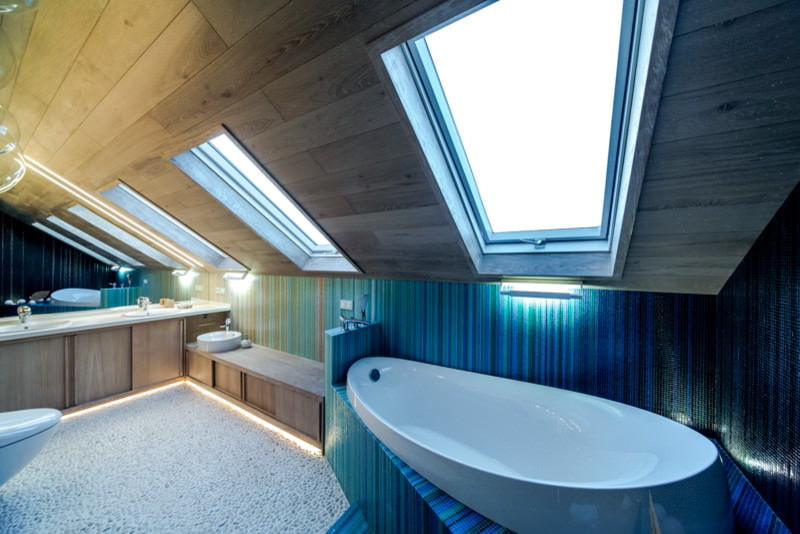 Dans la salle de bain mansardée, une combinaison de finitions est souvent utilisée - le bas des murs est carrelé ou lambrissé et le dessus est tapissé ou peint