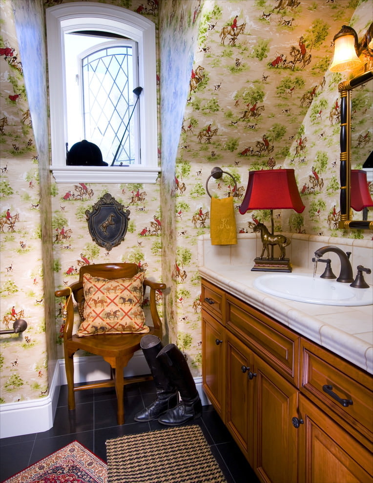 Le design utilise des motifs floraux (sur des panneaux muraux ou des carreaux). Le sol est carrelé de bois ou de pierre. Plomberie, en règle générale, dans un style rétro (robinets en cuivre et en laiton, baignoire courbe, lavabo bouclé).
