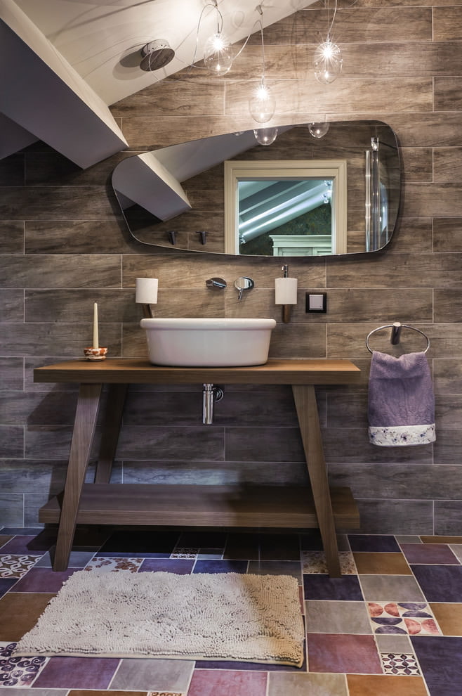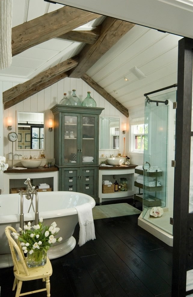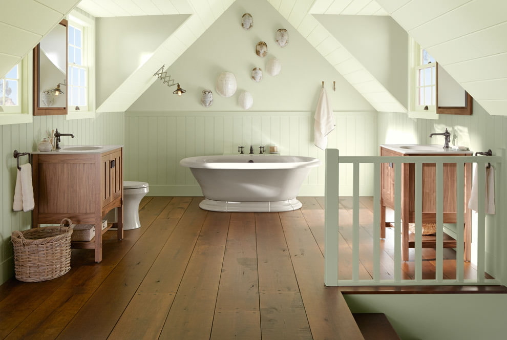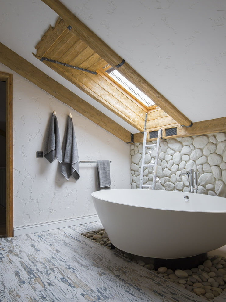 La décoration murale du grenier a ses propres caractéristiques. Il est nécessaire de se rappeler de la protection contre l'humidité excessive. Par conséquent, la priorité est donnée aux panneaux et carreaux résistants à l'humidité.S'il s'agit d'une salle de bain de style champêtre, les murs sont traités avec des antiseptiques et des hydrofuges. Vous pouvez utiliser du plâtre décoratif, également recouvert d'une composition résistante à l'humidité à base de cire. L'émulsion à base d'eau ou la peinture acrylique résistante à l'humidité conviennent bien à la peinture. Pour créer de la texture et du relief, vous pouvez utiliser du papier peint non tissé pour la peinture. Le vinyle et le papier ne peuvent pas être utilisés. Le vinyle ne laisse pas entrer l'air et le papier ne résiste pas à une humidité élevée.