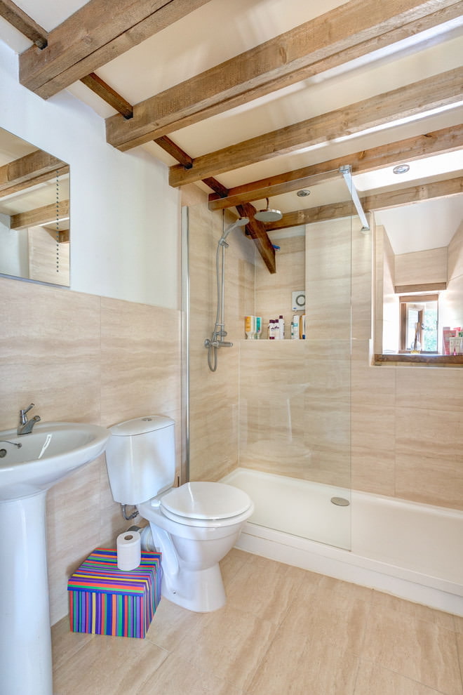 Les tons beiges sont parfaits pour décorer une salle de bain rustique.