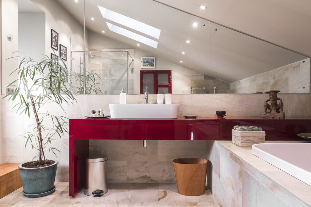 - Le décor est en rouge. Le rouge est une couleur puissante et vibrante. Si dans la salle de bain il y aura des nuances de framboise, de rubis, de fleurs de cerisier, alors vous avez besoin de la présence de tons rose clair. Le rouge diluera et équilibrera également la plomberie blanc neige ou les éléments décoratifs beiges (par exemple, un motif sur une tuile).