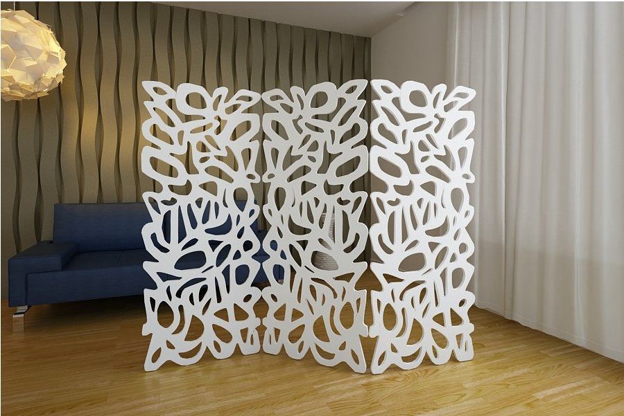 Un écran pliant en raison de sa praticité et de sa facilité d'utilisation est le type le plus courant de cloisons temporaires. Le design est assez stable et permet l'utilisation d'un tel écran même comme cintre. Les ceintures peuvent être solides ou divisées en sections - ces modèles vous permettent d'équiper l'écran d'étagères pour fleurs ou de petites choses de mercerie.