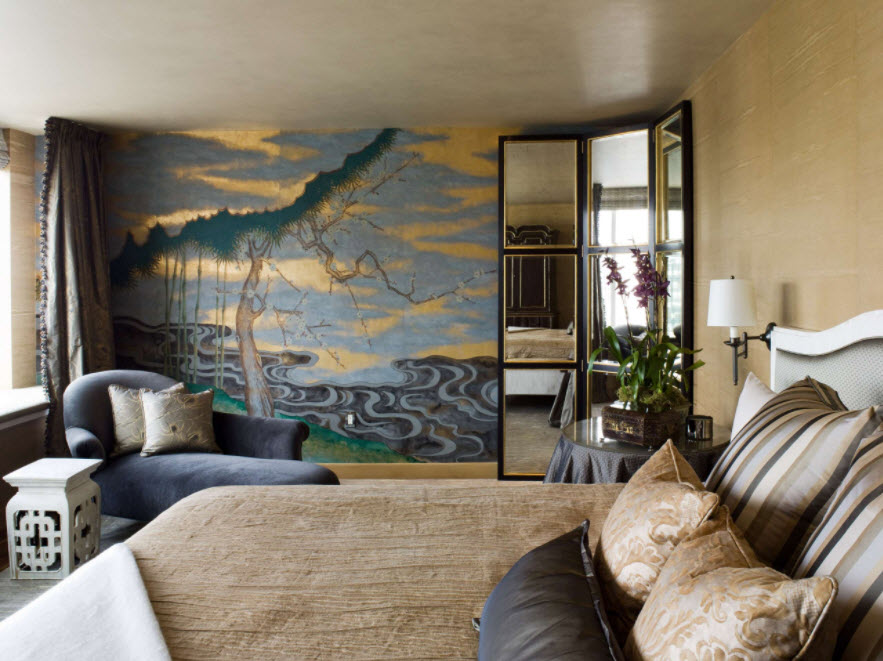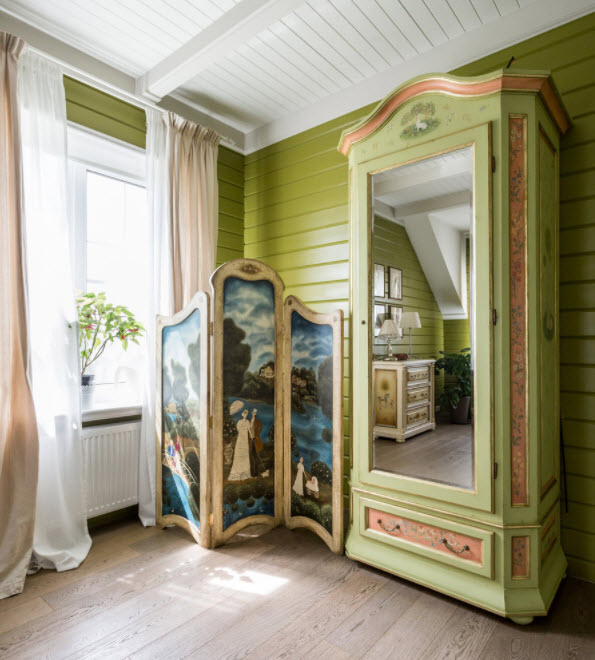 L'intérieur d'une chambre classique moderne se marie harmonieusement avec une structure légère et élégante en bois sculpté, utilisée comme un coin pour changer de vêtements. Un grand miroir au sol et un cintre peuvent être cachés derrière. L'écran, cachant les vêtements de la maison, assurera l'ordre dans la pièce.Dans la chambre, une cloison décorée de vitraux ou de tout autre matériau qui transmet la lumière, en combinaison avec une source de lumière arrière, peut être utilisée comme une lampe spectaculaire.