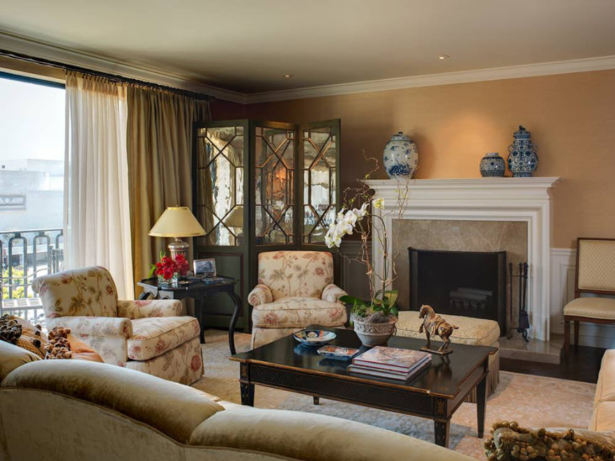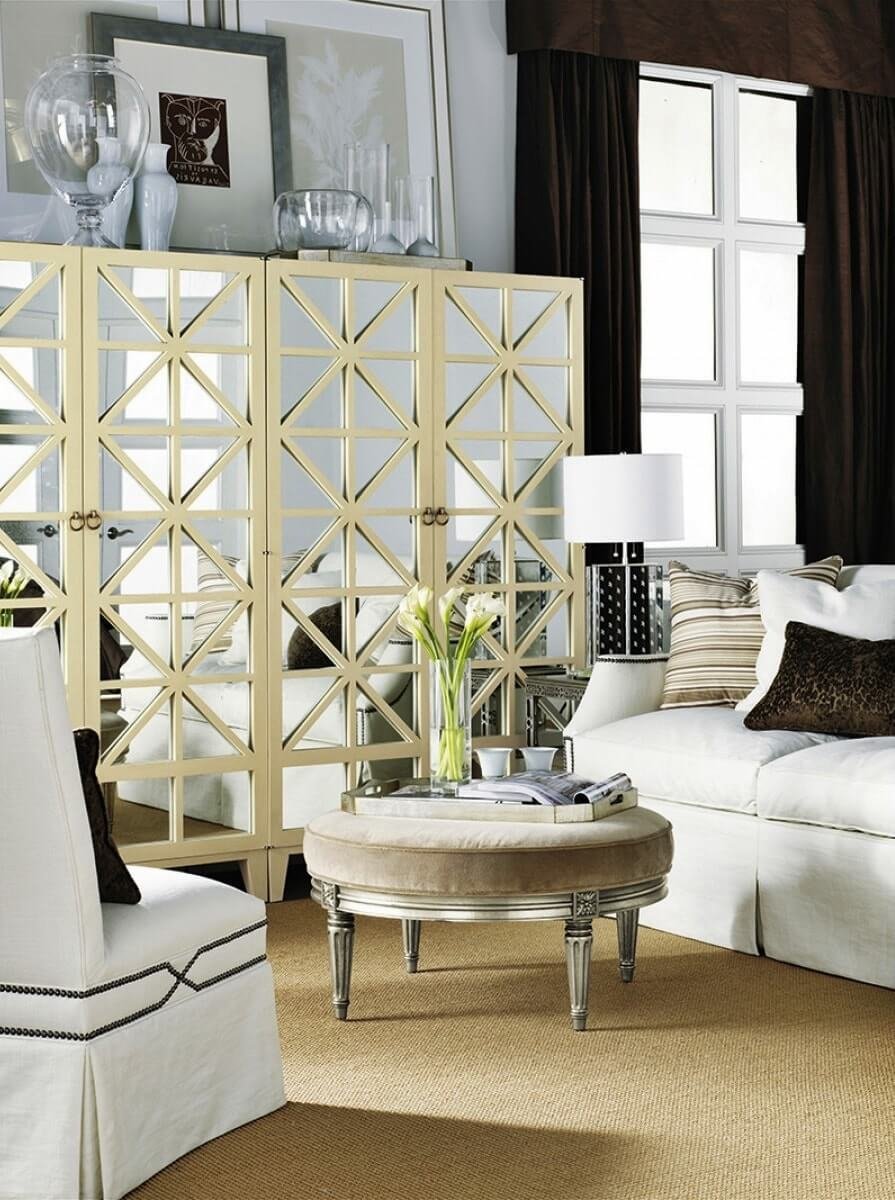 Dans le salon, un écran peut être utilisé pour agrandir visuellement l'espace, si des panneaux de miroir sont utilisés pour le faire. Placé devant ses compositions de fleurs d'intérieur, il donnera l'impression d'une grande serre.