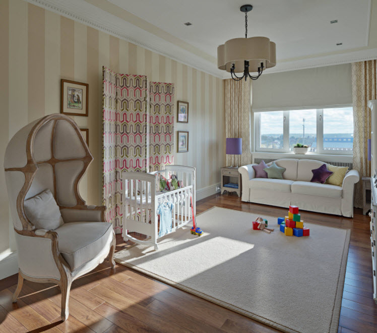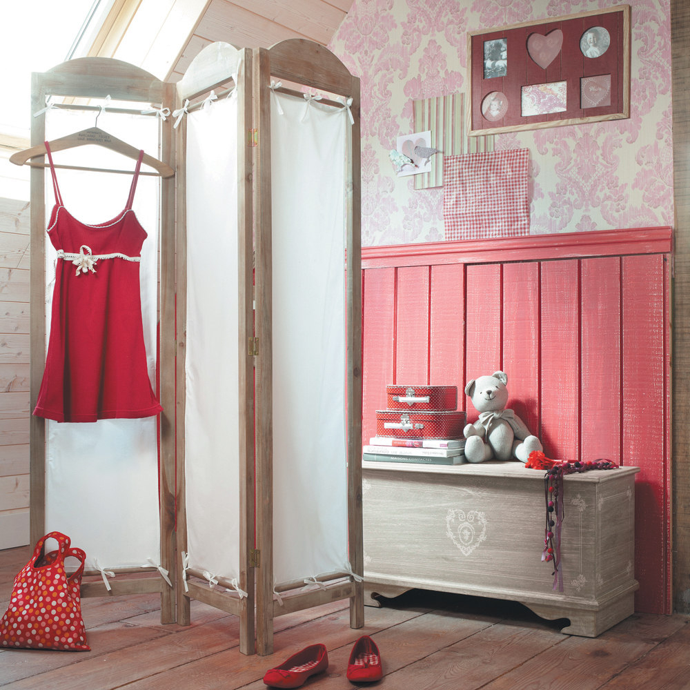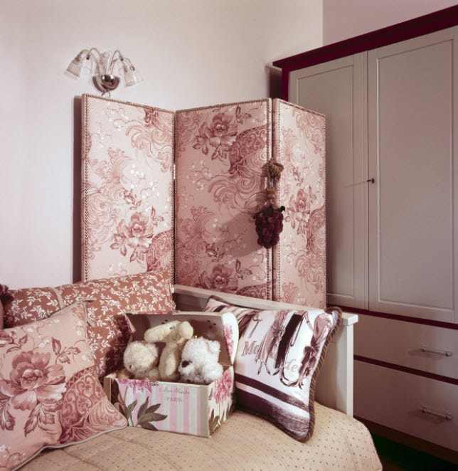 Si la crèche est destinée à deux enfants, notamment hétérosexuels, des écrans mobiles pour le zonage de l'espace dans la pièce sont tout simplement nécessaires. En plus de créer des zones isolées, les enfants eux-mêmes trouveront de nombreuses utilisations supplémentaires pour la partition temporaire. Cela peut être la scène d'un théâtre de marionnettes ou le rideau d'une salle de concert. Si les parents veulent faire preuve d'imagination et faire un écran par eux-mêmes, ils pourront lui fournir une masse de poches pour les jouets de leurs enfants préférés et diverses bagatelles, petites fenêtres et autres choses.