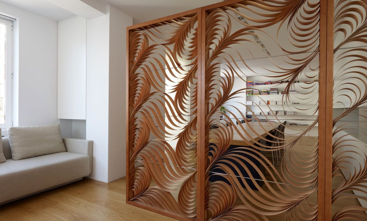 Vous pouvez utiliser un écran avec un motif géométrique qui, associé à un mur uni ou à un deuxième écran ordinaire, donnera un effet étonnant d'espace "déplié".