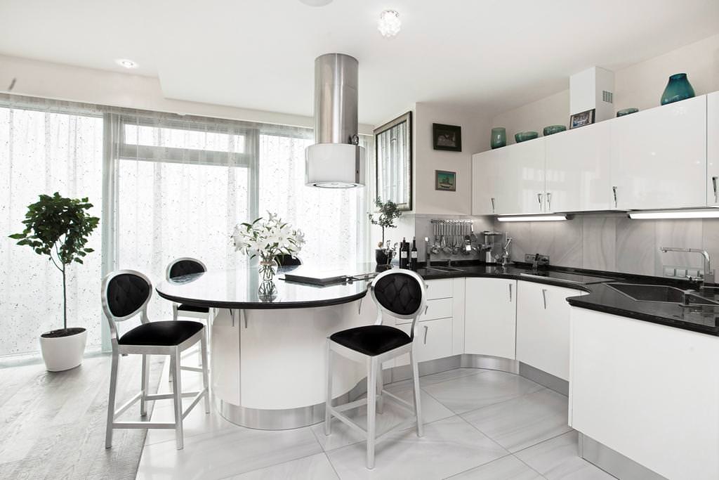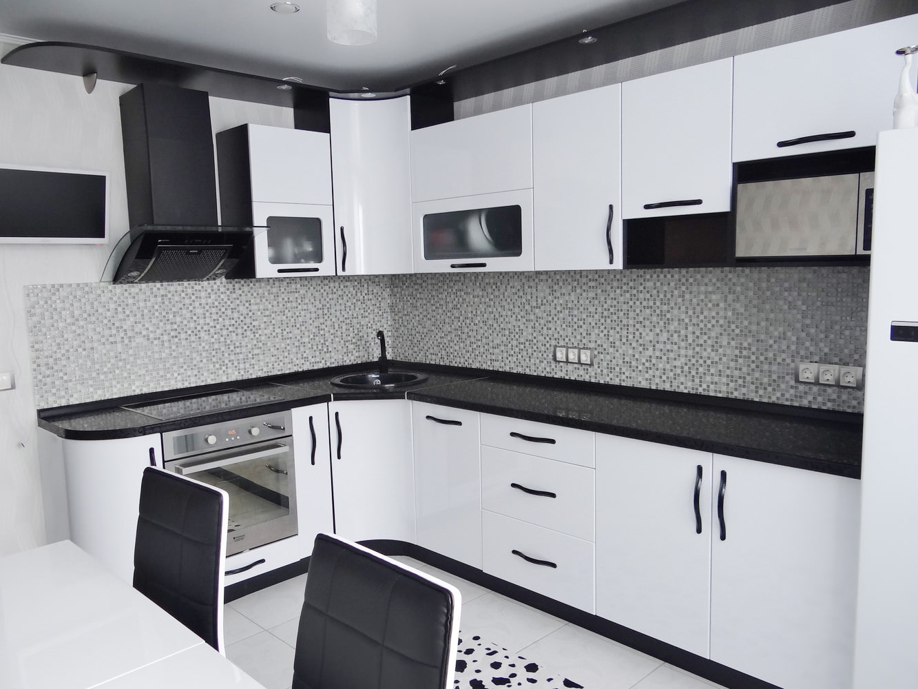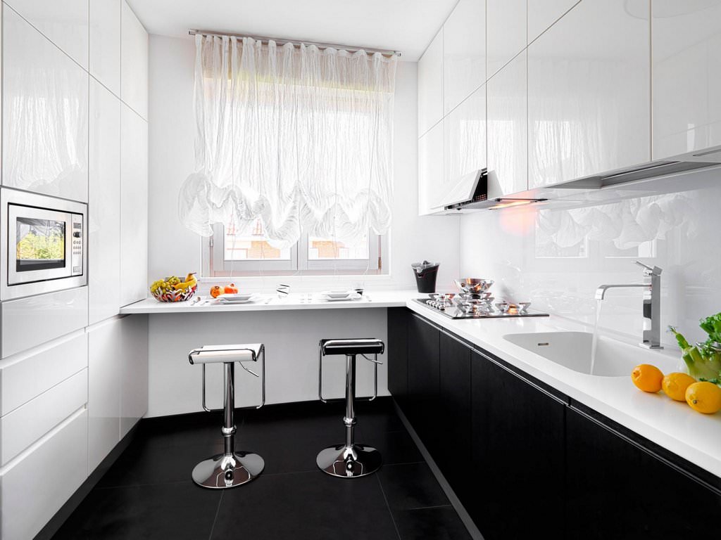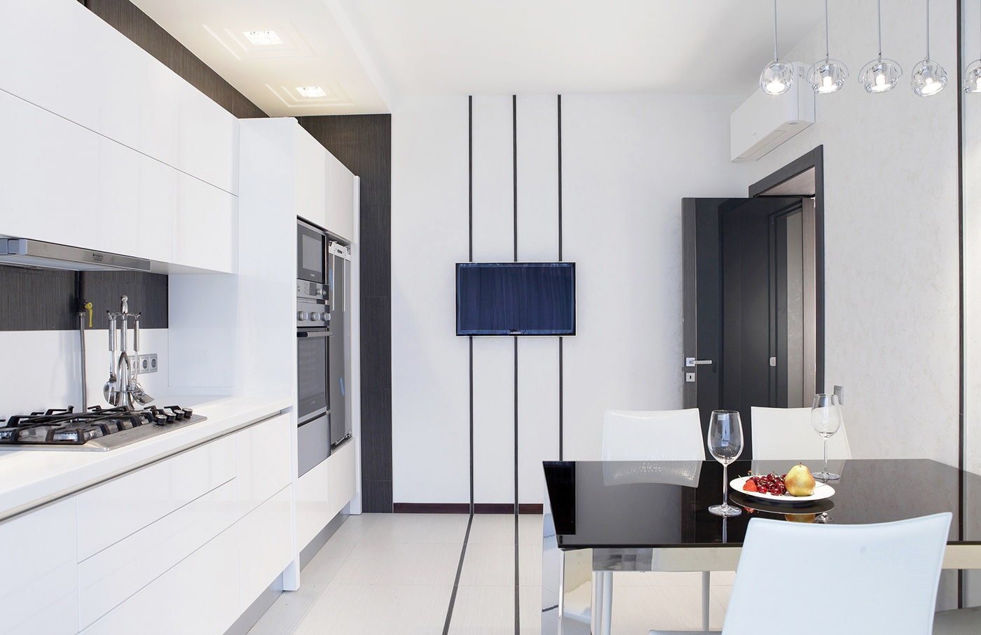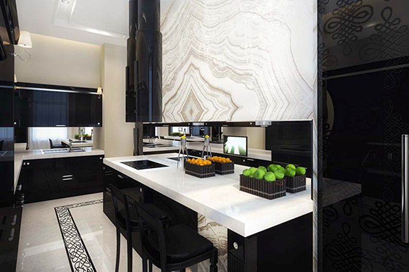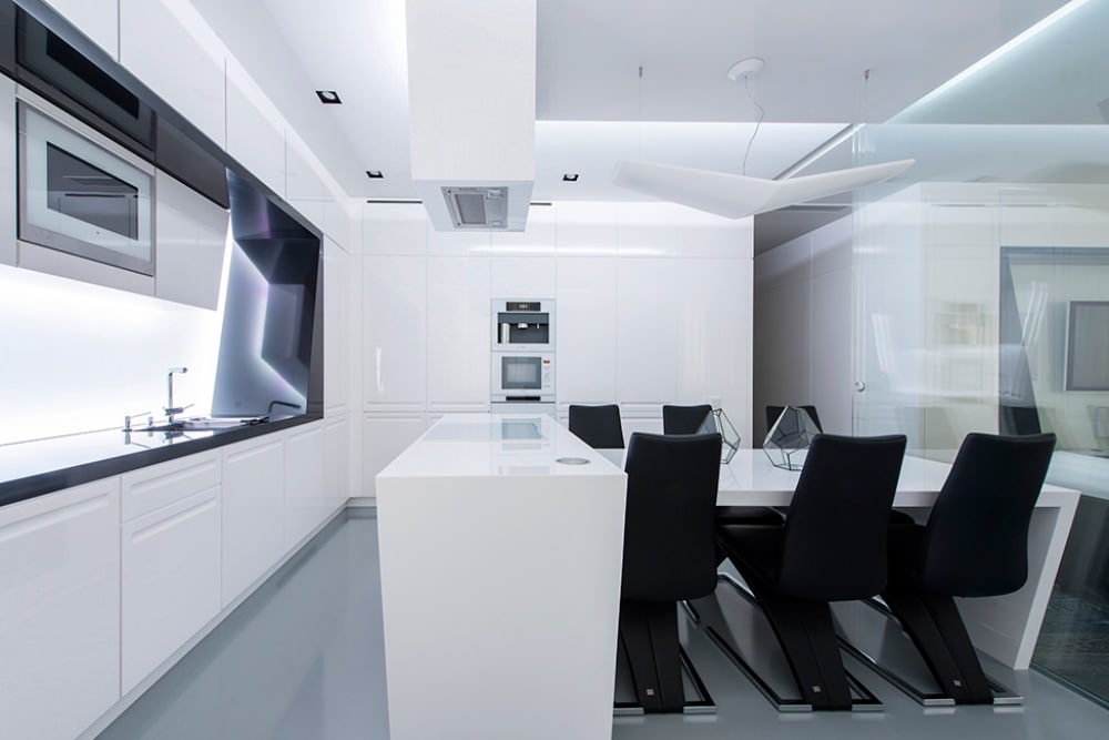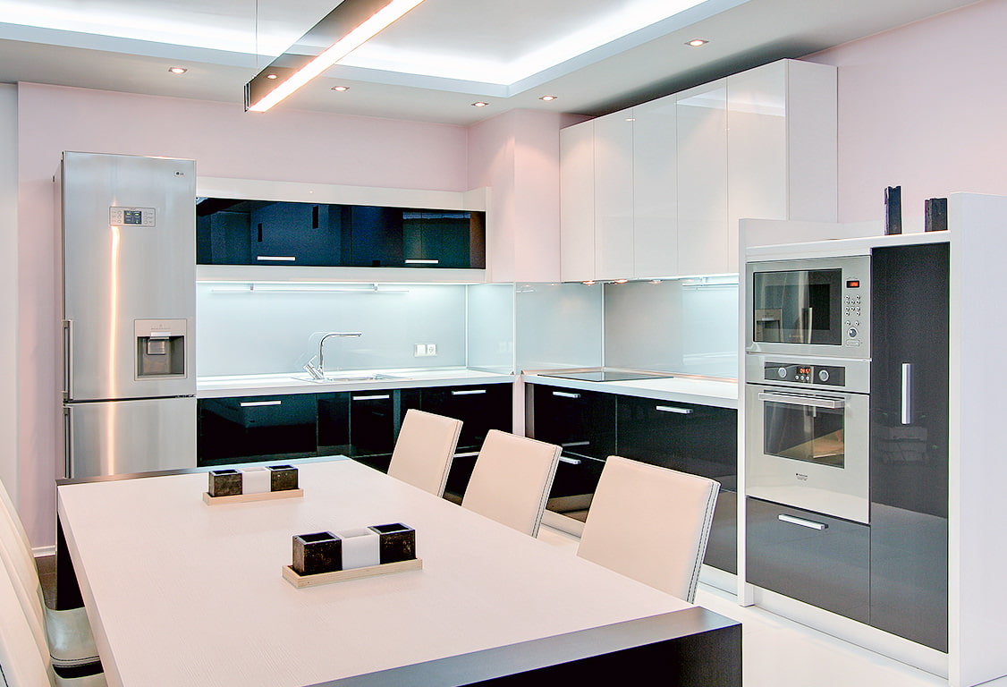 Dans la cuisine, la principale perception de propreté et d'espace, en rapport avec cette couleur dominante ici, devrait être le blanc. Avec l'aide d'une cuisine noire, vous pouvez vous diviser en un espace salle à manger et bureau, organiser des effets qui augmentent visuellement la pièce.