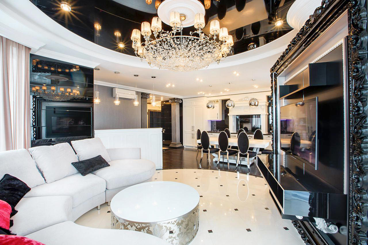 - Concevoir un appartement en style noir et blanc par vous-même est assez difficile. Les concepteurs professionnels accordent une grande attention à la proportionnalité, en faisant une couleur primaire et la seconde - accompagnant ou accent. Pour la solidité et le luxe, des surfaces mates sont utilisées, et pour le romantisme et la légèreté - le brillant.