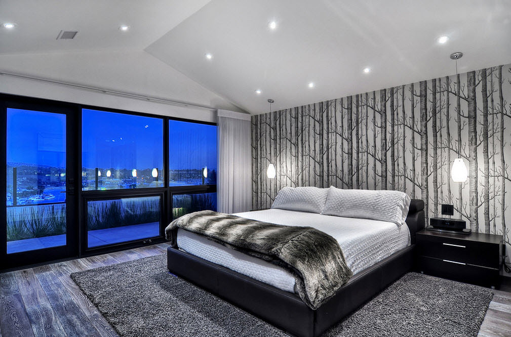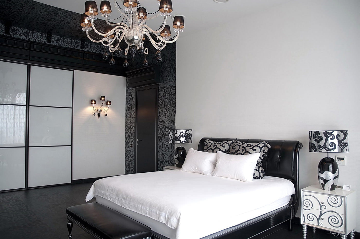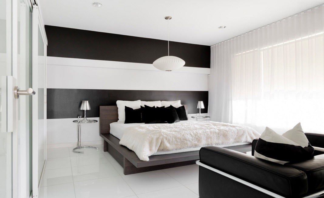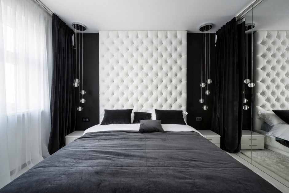 Dans la chambre, le contraste noir et blanc peut sembler trop net, ce qui affectera le repos et le sommeil. Afin d'ajouter du confort et de la douceur à la chambre, il est nécessaire d'inclure des tons beige, argent ou autres pastels à l'intérieur en raison des textiles et des accessoires.