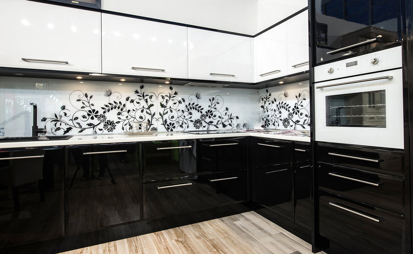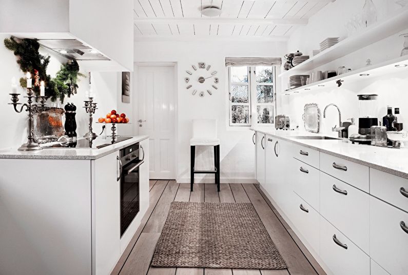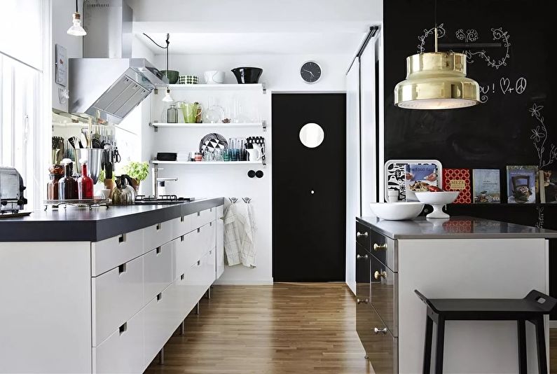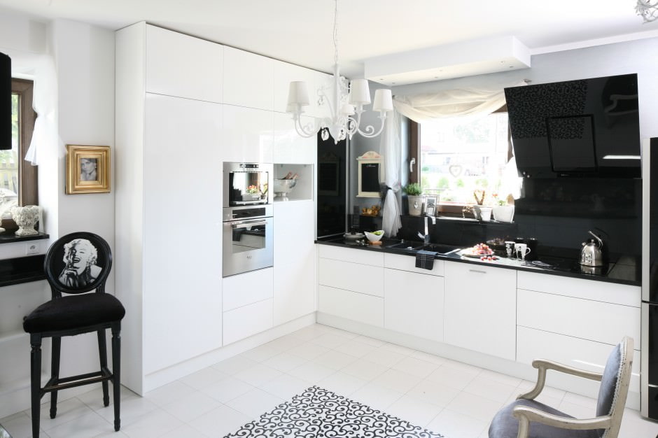 Un bon exemple d'agencement est le mobilier de cuisine avec des façades blanches supérieures et noir inférieur en combinaison avec des murs clairs. Les motifs adaptés à l'intérieur peuvent être ornés de façon traditionnelle. Les taches lumineuses dans la cuisine peuvent être des nappes orange et vertes, des rideaux, des housses de chaise, des horloges, des maniques, etc.